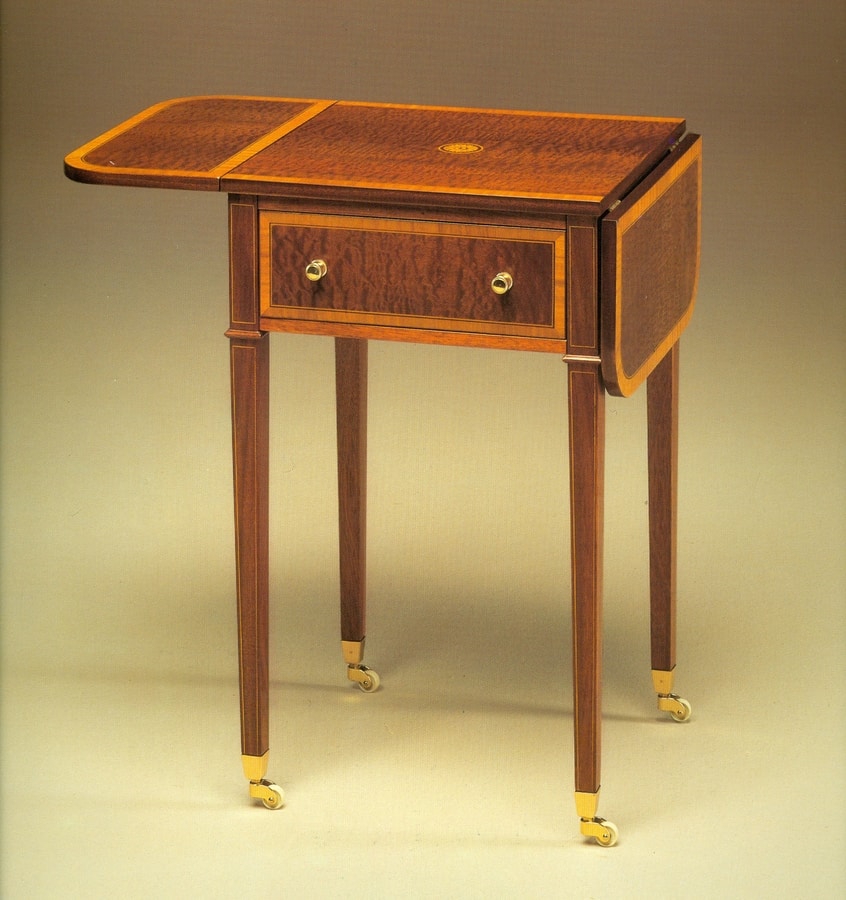 Table d'appoint avec ailes et roulettes. Style anglais. En bois massif, incrusté à la main dans du bois " Citronnier ". Avec tiroir.