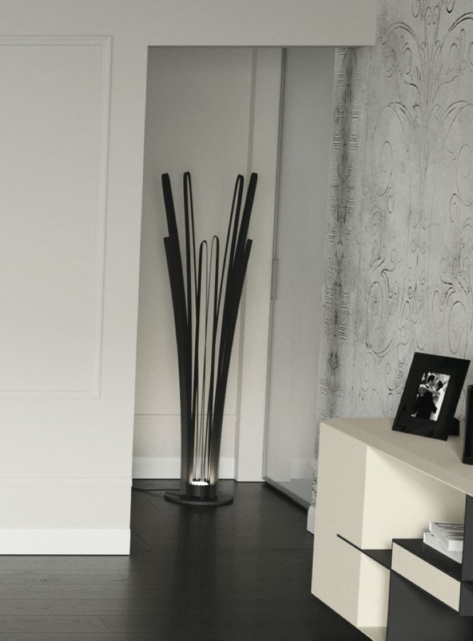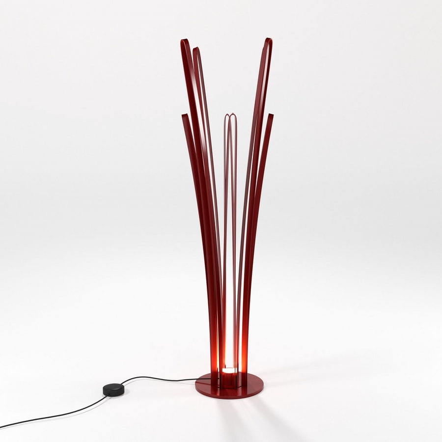Lampe en fer massif travaillé à la main, avec lumière à led. Ici présentée dans les finitions laqué gris anthracite - "laccato antracite" - et laqué rouge - "laccato rosso".