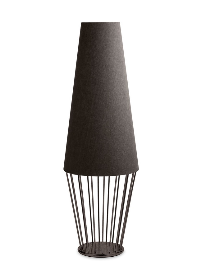 La structure en forme de cage est réalisée avec des tiges d'acier et de laiton moulé sous pression, avec soudure affleurante en laiton et est disponible en bain galvanique d'or, de cuivre ou de nickel noir ou en fer métallique. L'abat-jour tronconique est en coton ou en lin traité. Une lampe sur pied au design moderne qui s'adapte à tous les styles, parfaite pour un salon également en combinaison avec des lampes Sofia de différentes tailles.