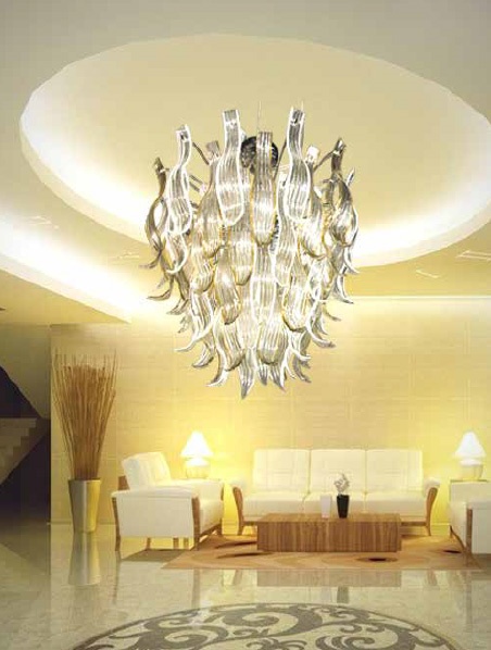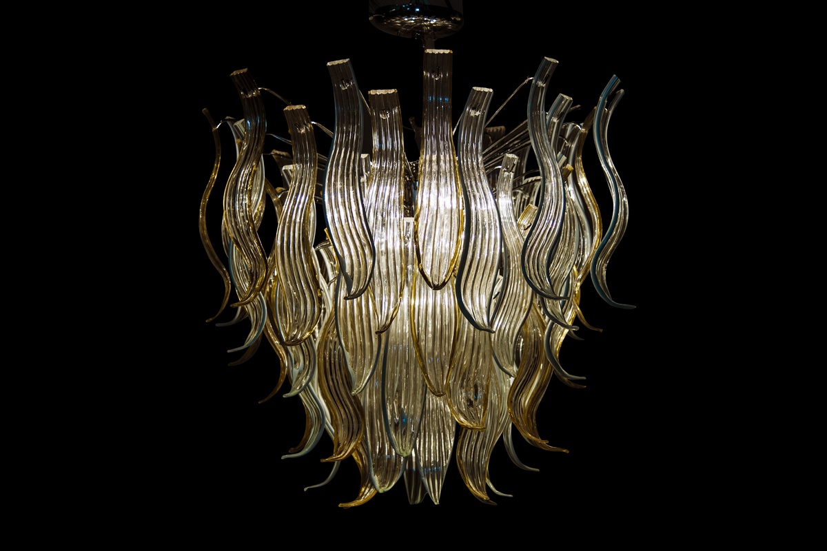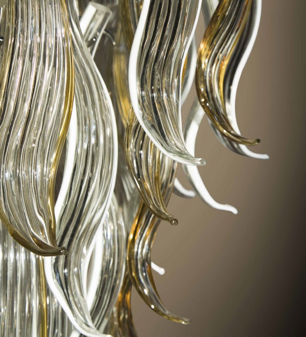 Lustre avec feuilles de verre fait main, dans deux combinaisons différentes de couleurs: clair avec le profil blanc et transparent avec le profil ambre. Taille personnalisée disponible sur demande.