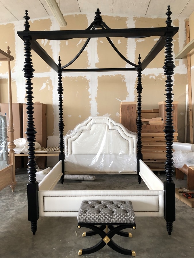 Lit de canopée en bois de hêtre avec banc de style classique, Custon fait. Tête de lit rembourrée.