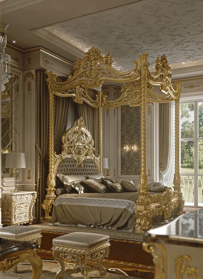 Lit à baldaquin luxueux, en bois sculpté à la main et doré.