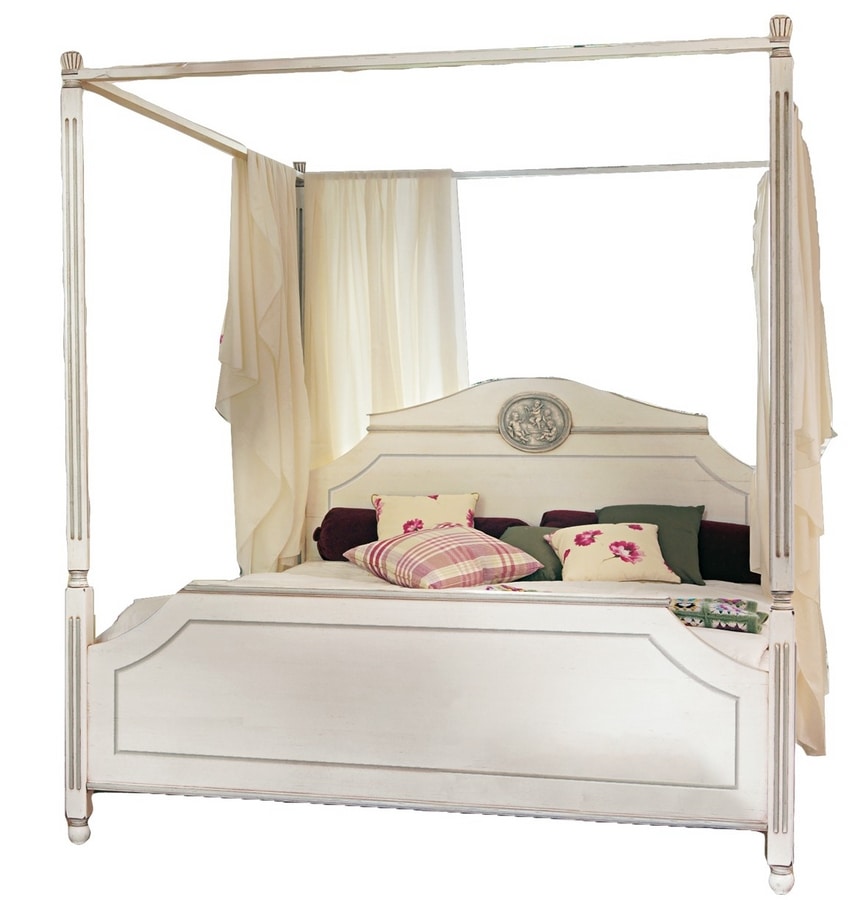 Lit à baldaquin avec pied de lit et montants ornés de rainures verticales, tête de lit décorée de bas-reliefs en plâtre. Si nécessaire, le message peut être supprimé ultérieurement. Sur la photo, structure laquée gris à patine chaude (code : Grigio Faber) et profilés laqués blancs (code : Bianco), patinage normal.