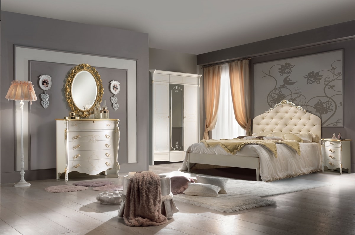 Lit Bellini 180x200 rembourré, structure laquée avec détails dorés.
