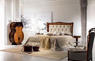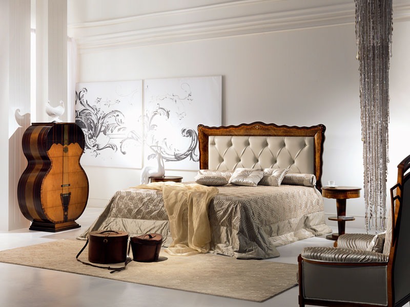Lit classique avec tête de lit rembourrée capitonné. La tête de lit est bordée de bandes courbes en bois massif avec placage cerejeira featherband et le palissandre et palissandre chantournage. Points de la mère-ofpearl sont fixés dans le bois massif. Le panneau central est rembourré et recouvert de cuir de vachette pleine fleur aniline. Matelassage rembourré avec des perles décorées avec cristal Swarovski. Les buffets sont également moulées et ont chantournage riche. Sur demande, une lumière dirigée derrière le cadre de lit est disponible.