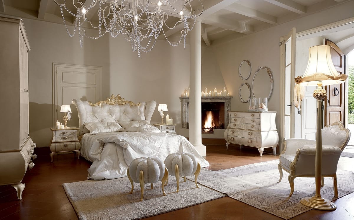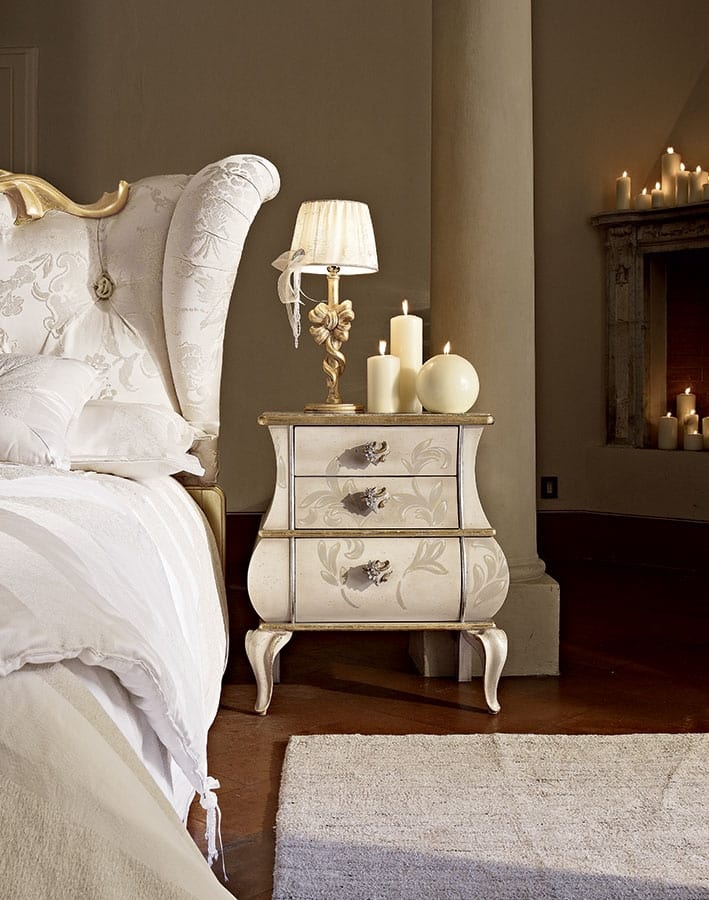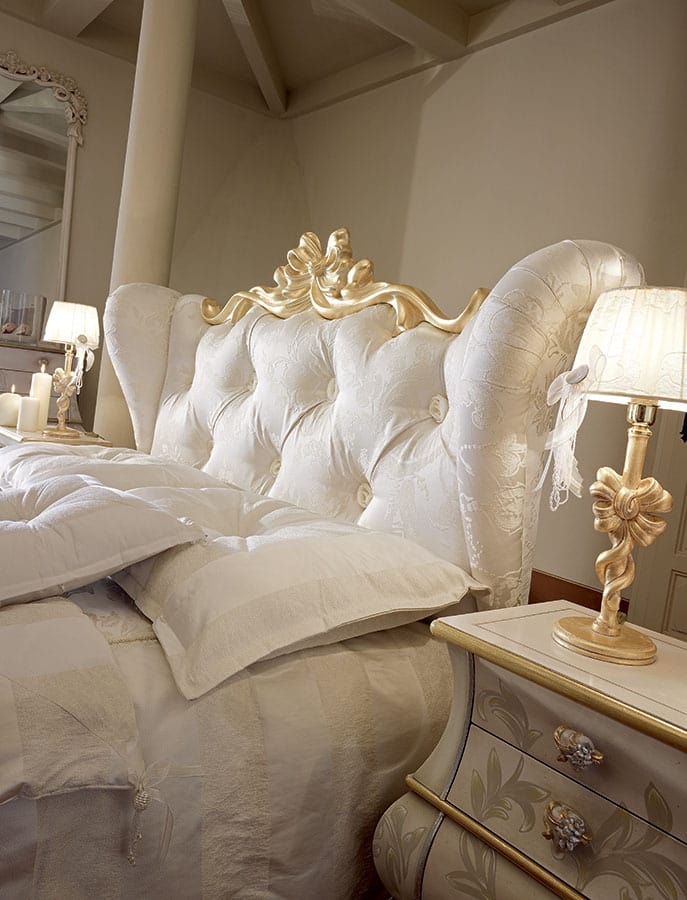 Les principales caractéristiques de cette chambre Matilde sont des nuances de blanc et une finition dorée blanchie dans un jeu de tons agréable et raffiné.