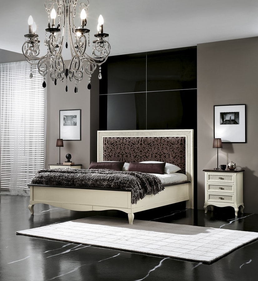 Lit avec tête de lit rembourrée et pied de lit bas. Finition laquée blanche.