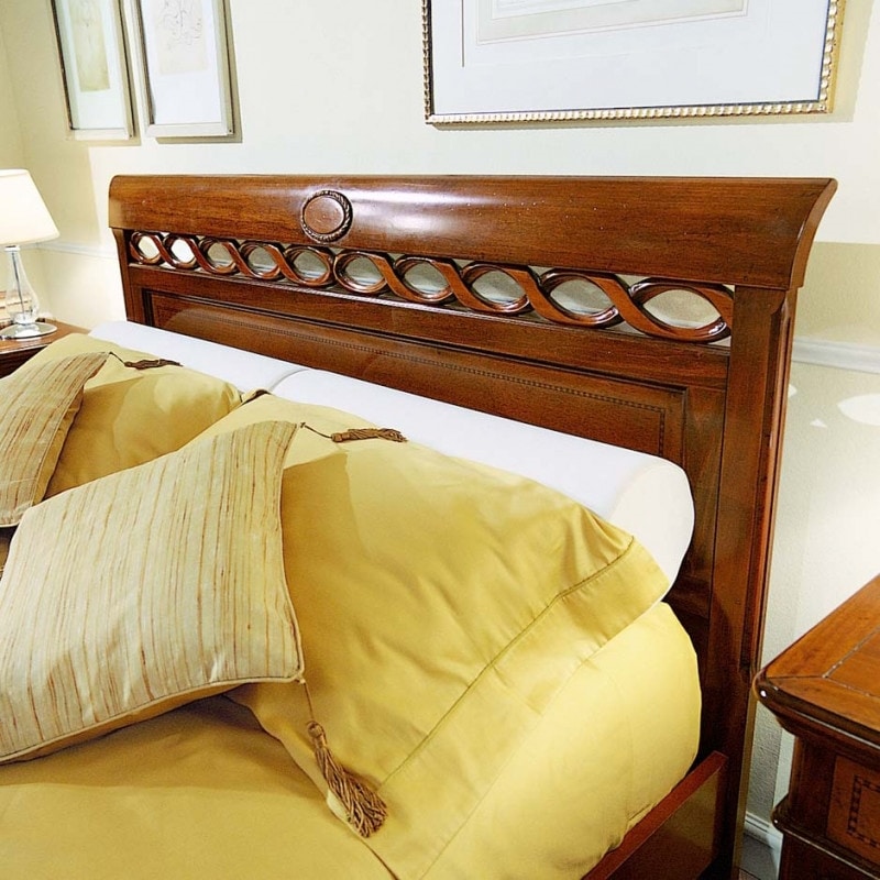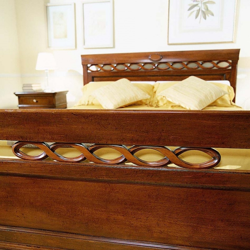Demander prix Produits similairesLit double avec tête et pied de lit de forme élégante et importante, encadré de cadres en bois. Sur la tête et le pied de lit du lit se trouvent deux épaulements verticaux, interrompus en partie haute par un vide créé astucieusement pour alléger l'ensemble. Un médaillon sculpté de forme ovale est inséré dans le profil supérieur de la tête de lit. Des tresses de bois sculptées sont insérées dans le vide présent dans la tête et le pied de lit.