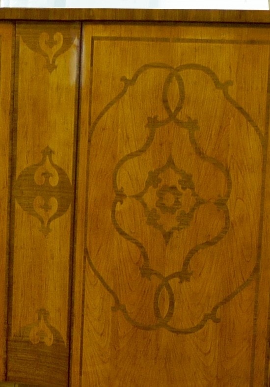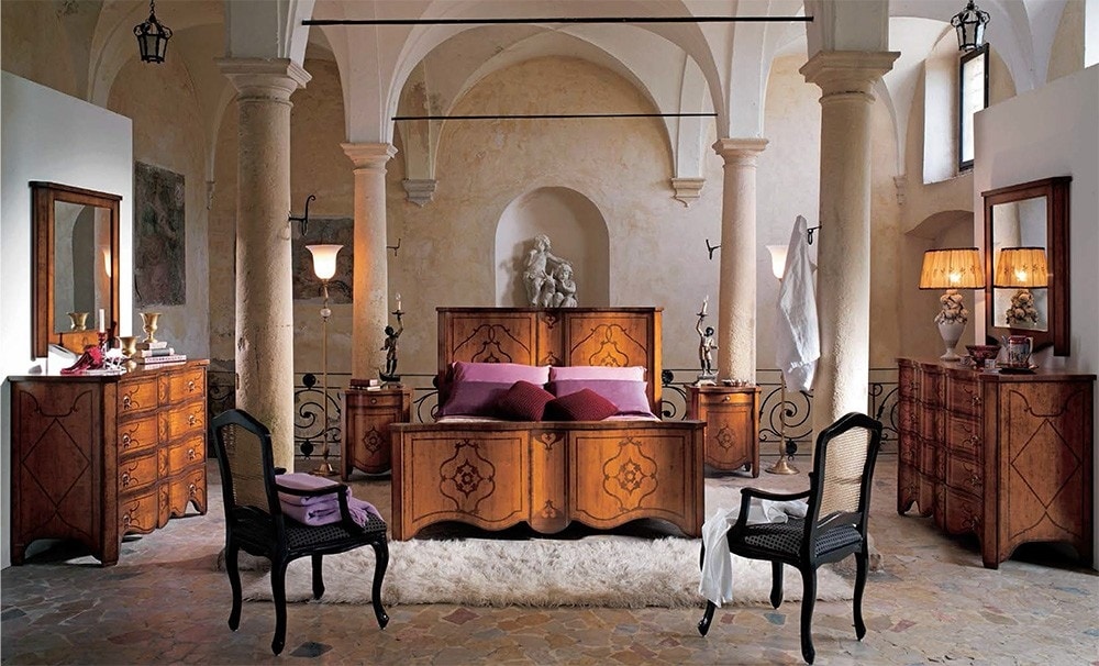 Lit marqueté Louis XV, inspiré du style du milieu du XVIIIe siècle. La forme des éléments est assortie aux lignes gracieuses et nettement ondulées du tablier du pied de lit. Incrustations bicolores rigoureuses de merisier et de noyer avec un motif d'arabesque symétrique.