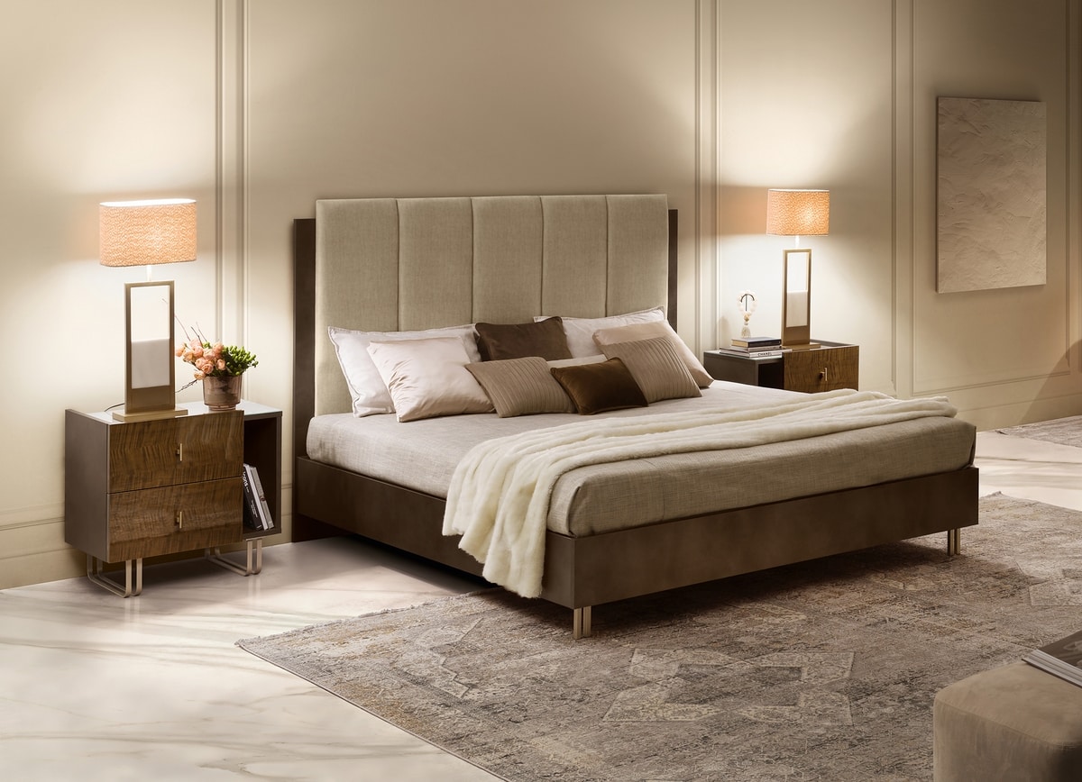 Demander prix Produits similairesLe lit est disponible en deux versions: une avec cadre de lit et pied de lit en finition bronze mat et une version entièrement rembourrée.