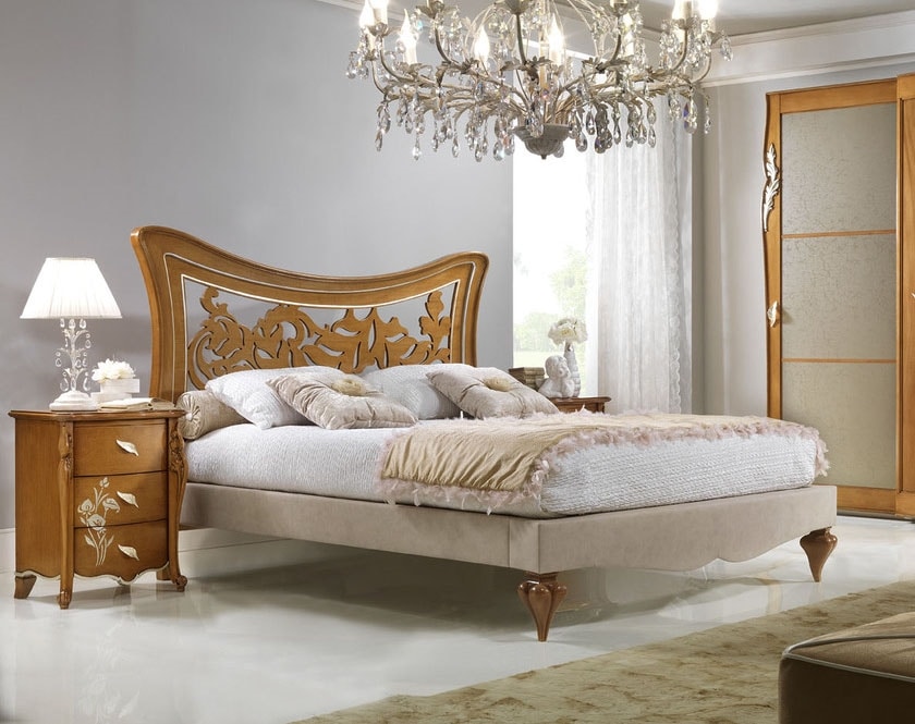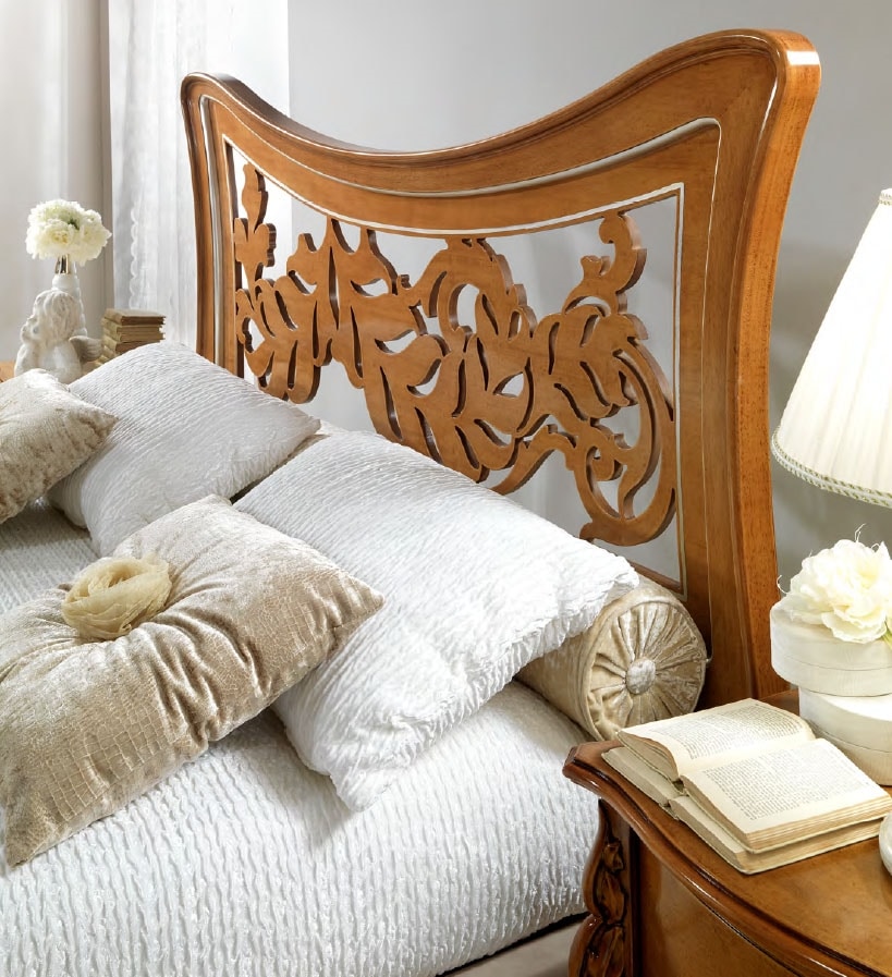 Lit en bois avec tête de lit perforée. Cadre de lit recouvert d'éco-cuir.