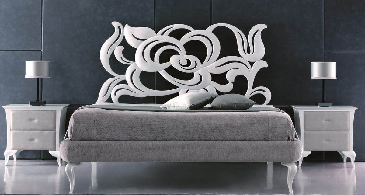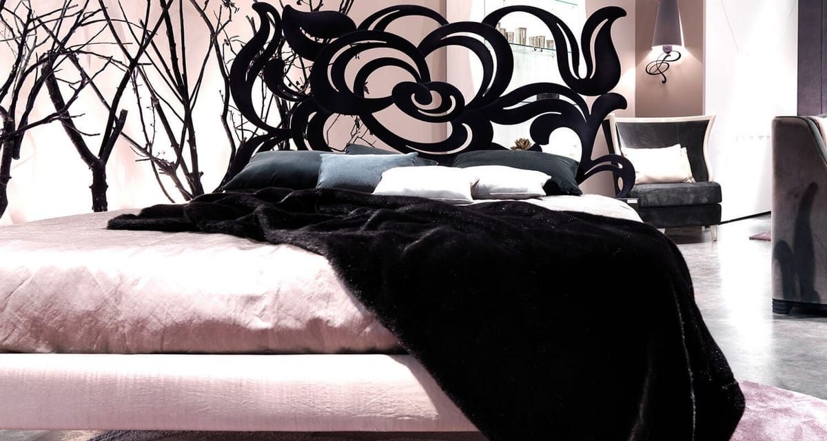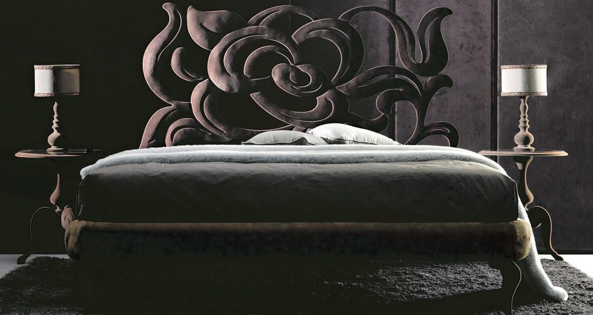 Un lit de fer décoratif, avec tête de lit en fer forgé découpé au laser, à effet tridimensionnel; le lit de fer est rembourré et recouvert de cuir, éco-cuir, tissu. L'épaisseur robuste des courbes en fer, caractéristique principale de Megan, rappelle les pétales de roses sensuelles: un effet remarquable pour un lit inoubliable. Structure en fer découpé au laser façonné à la main et poli. Bedrail en fer convenant à la tapisserie d'ameublement et aux jambes massives de hêtre.