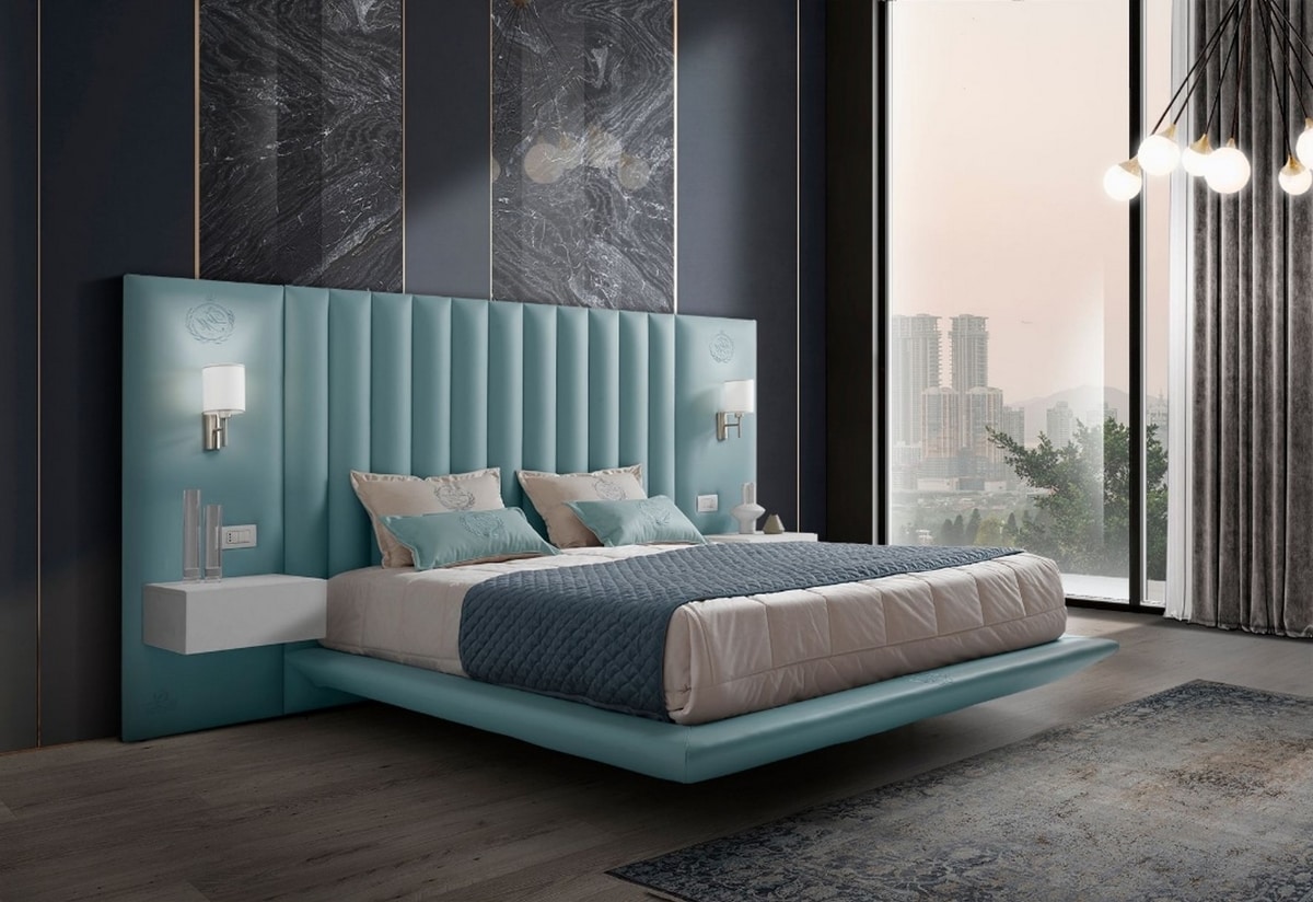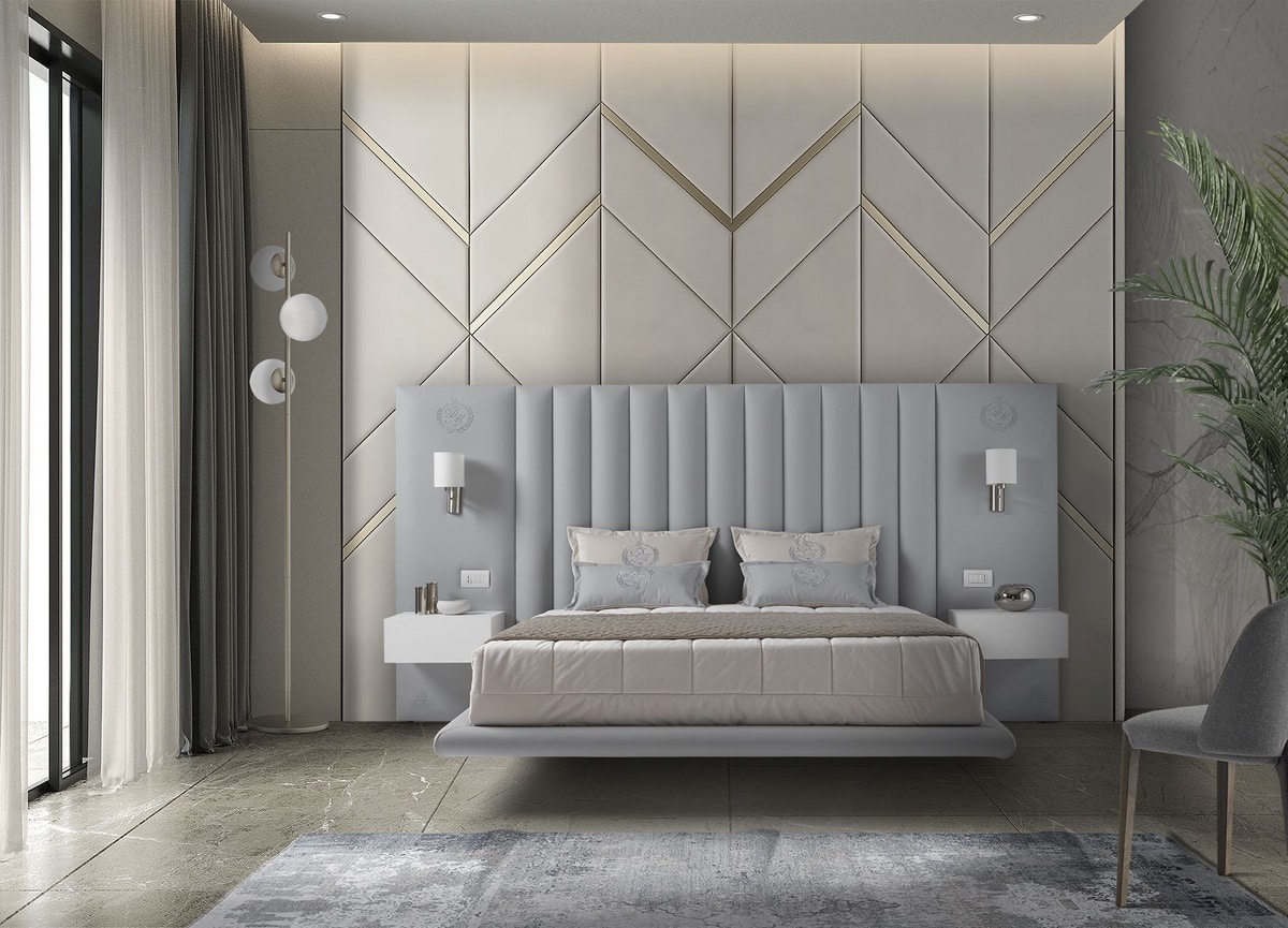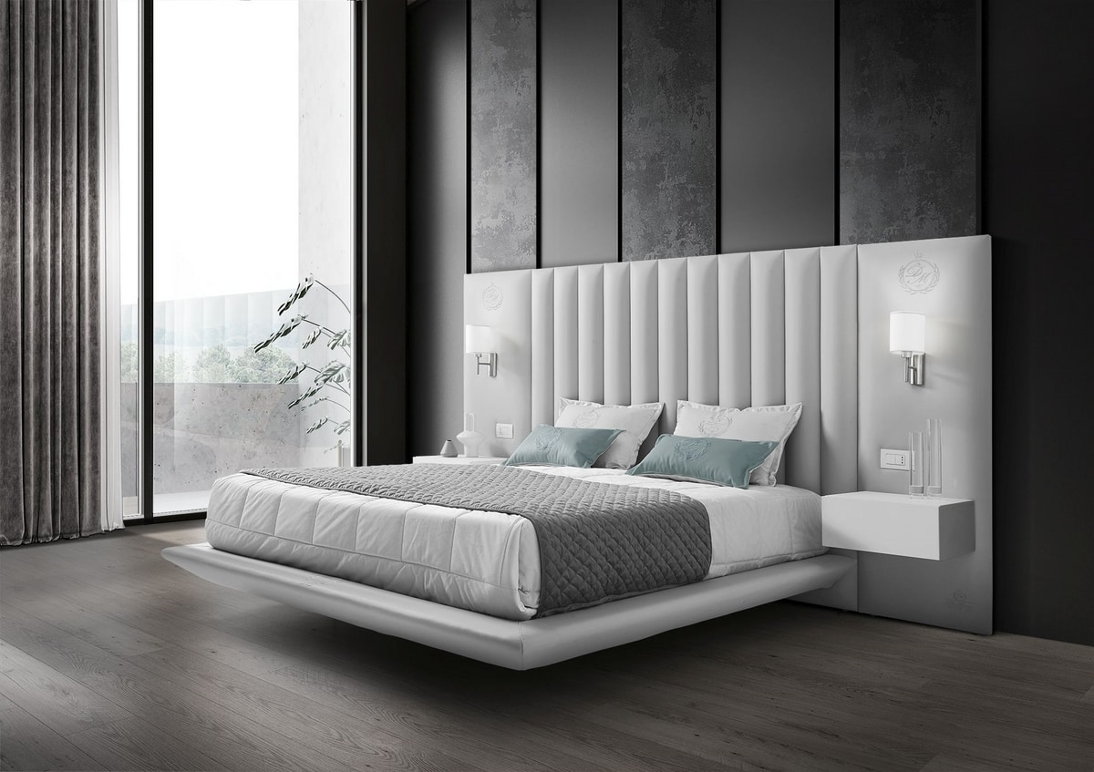 La surface du lit suspendu amplifie la sensation de légèreté, tandis que les tables de chevet intégrées apportent fonctionnalité et continuité visuelle.