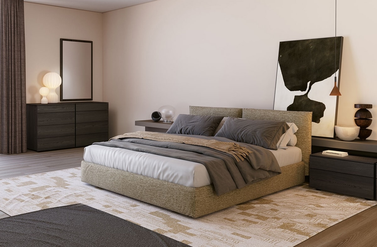Lit double avec tête de lit rembourrée Kate LM50. Tête de lit double rembourrée avec doublure amovible, en tissu, cuir ou éco-cuir. Combinaisons possibles avec les différents types de sommiers de la collection, également en bois. Les composants de base en bois sont disponibles dans les finitions Elli. Le filet de support ErgoAir est livré avec des lattes orthopédiques spéciales en bois, des supports silencieux et un périmètre en finition époxy pour réduire les champs magnétiques. Mouvements manuels ou électriques disponibles (non compatible avec boîte de rangement). Dimensions extérieures de la boîte: cm 151x191x25. Dimensions intérieures: cm 146x186x22. La hauteur du matelas par rapport au sol est de 30 cm. Il est disponible en versions simple, queen-size et sur mesure.