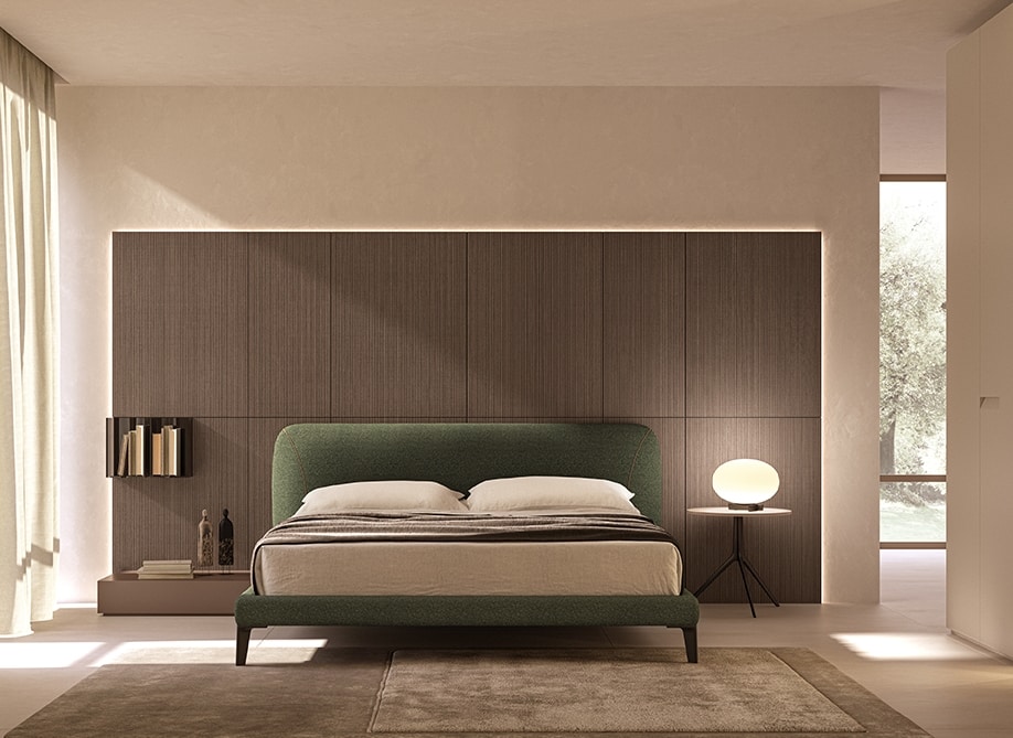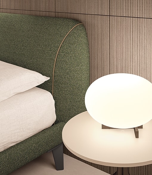 Le lit Riviera, associé à la Boiserie et à la table basse Jimmy et à la banquette de sol, donnent vie à une composition raffinée et éclectique.