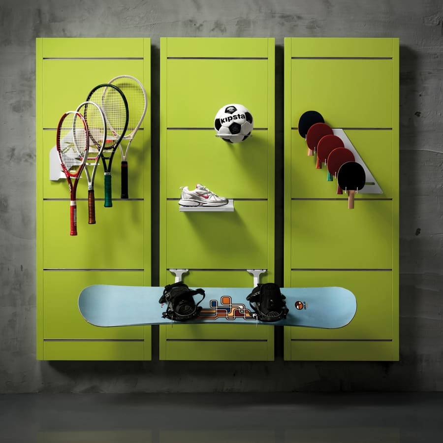 • Les unités modulaires murales à lattes où il est possible d'accrocher divers accessoires, y compris: petites étagères, supports de raquettes, supports de balle, supports de snowboard et bien plus encore.