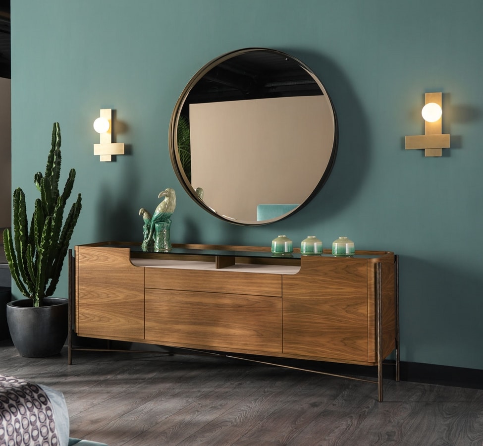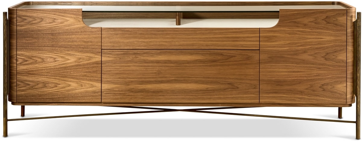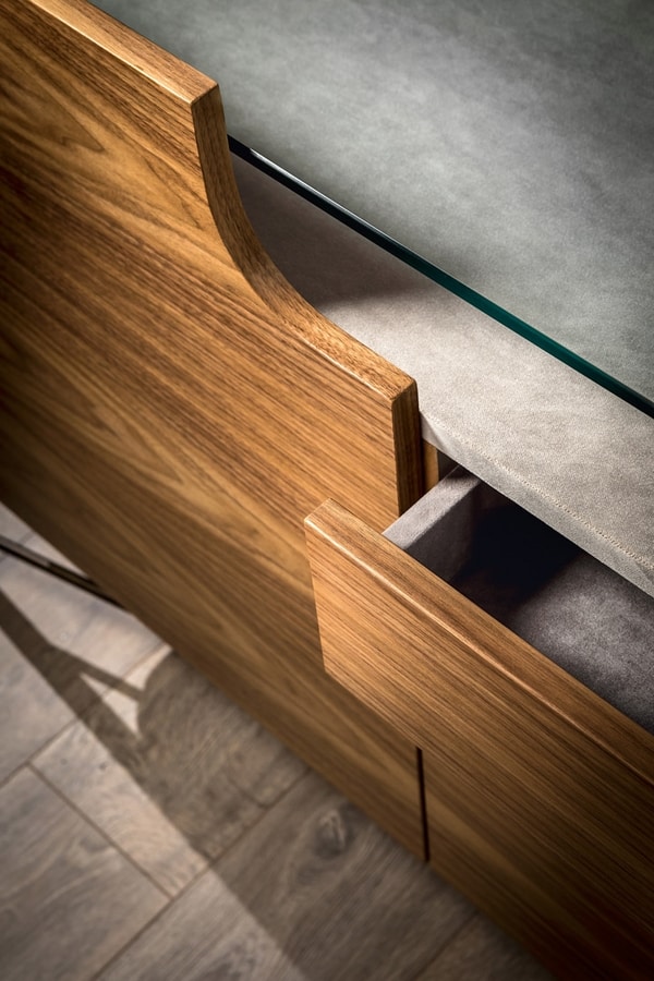 Commode ou buffet en bois Shanghai, composée de deux portes latérales, de deux tiroirs centraux à fermeture amortie et d'un plateau en verre.
