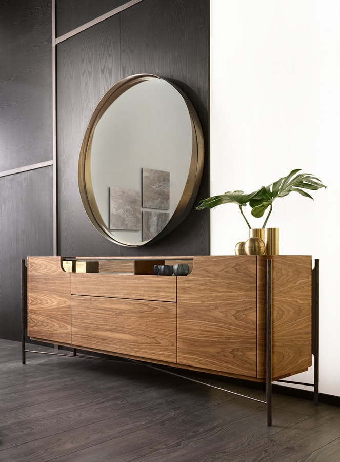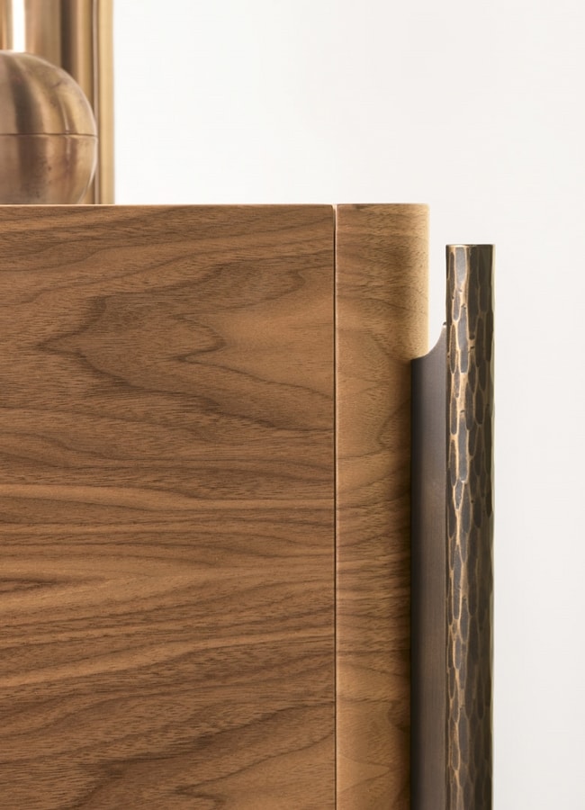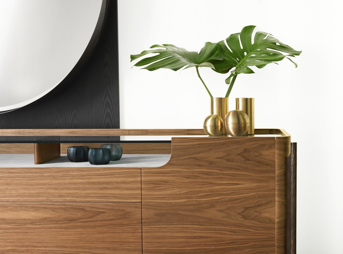Le compartiment sous le plateau, recouvert d'econabuk, peut devenir une présentation raffinée d'objets de collection ou de valeur. L'ensemble s'intègre parfaitement aux intérieurs laqués, créant un meuble harmonieux. Initialement destinée à l'espace nuit, cette commode peut également être réinterprétée pour l'espace séjour, pouvant servir de présentoir et de contenant. Ses lignes soignées et modernes en font un objet capable de se démarquer dans n'importe quel environnement.