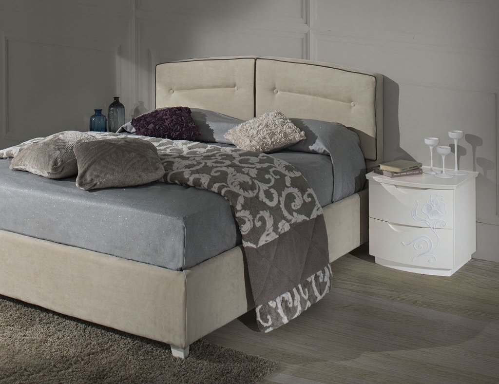 • Lit avec conteneur et sommier à lattes en bois 160 × 195 avec support central inclus, sommier haut capitonné recouvert de tissu nabucco léger. Tête de lit rembourrée en tissu léger nabucco.