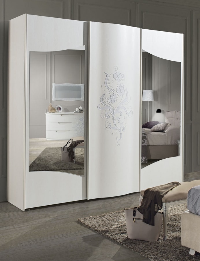 • Armoire à 3 portes coulissantes, portes latérales avec miroirs et centrale décorée à la main. Intérieur inclus en standard: Nr. 1 commode avec 3 tiroirs, Nr. 2 grandes étagères et nr. 2 petites étagères, n° 8 tubes pour cintres. Portes à fermeture douce.