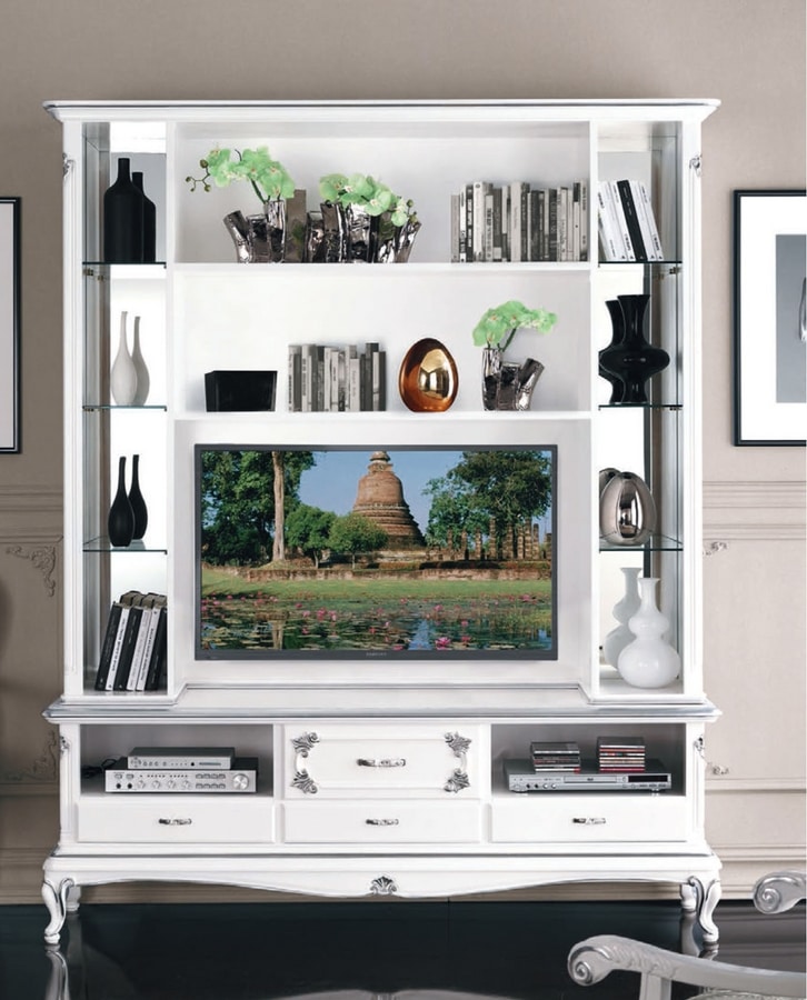 Meuble tv de style Art Déco. Structure en bois et tablettes latérales en verre. Finition laquée blanche avec décorations en plomb argenté.