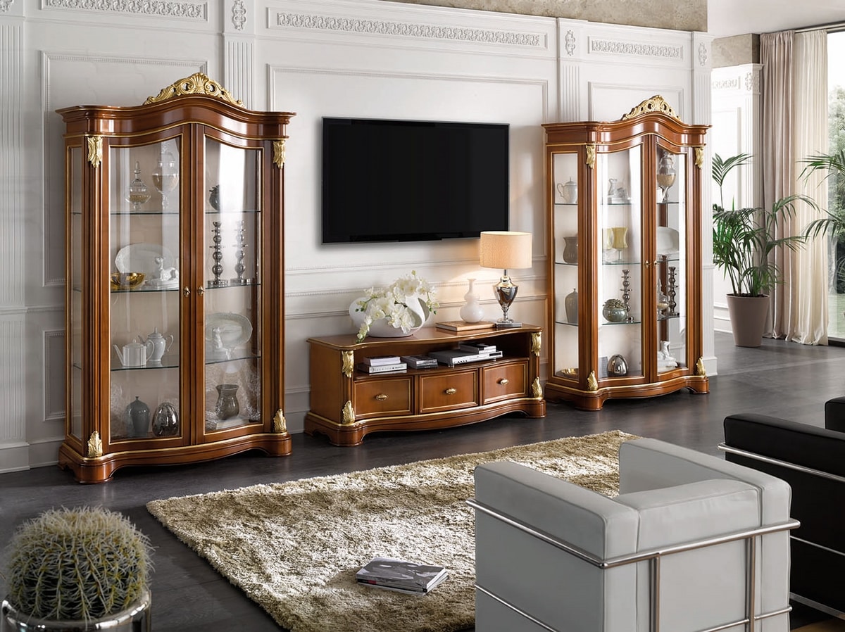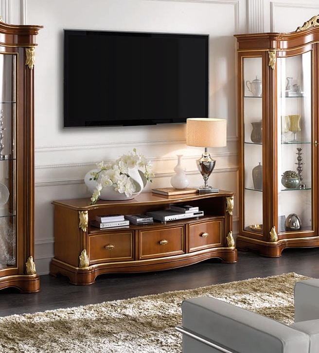 Meuble TV avec 3 tiroirs. Structure en bois avec sculptures décoratives et détails dorés.