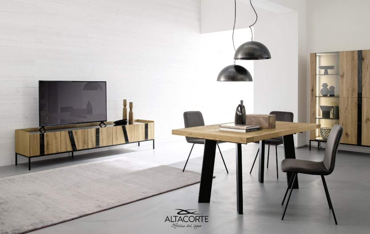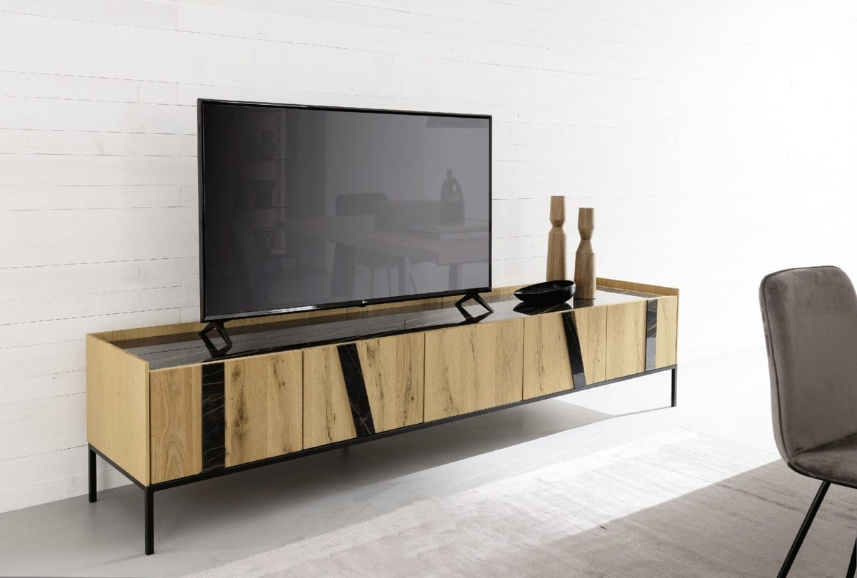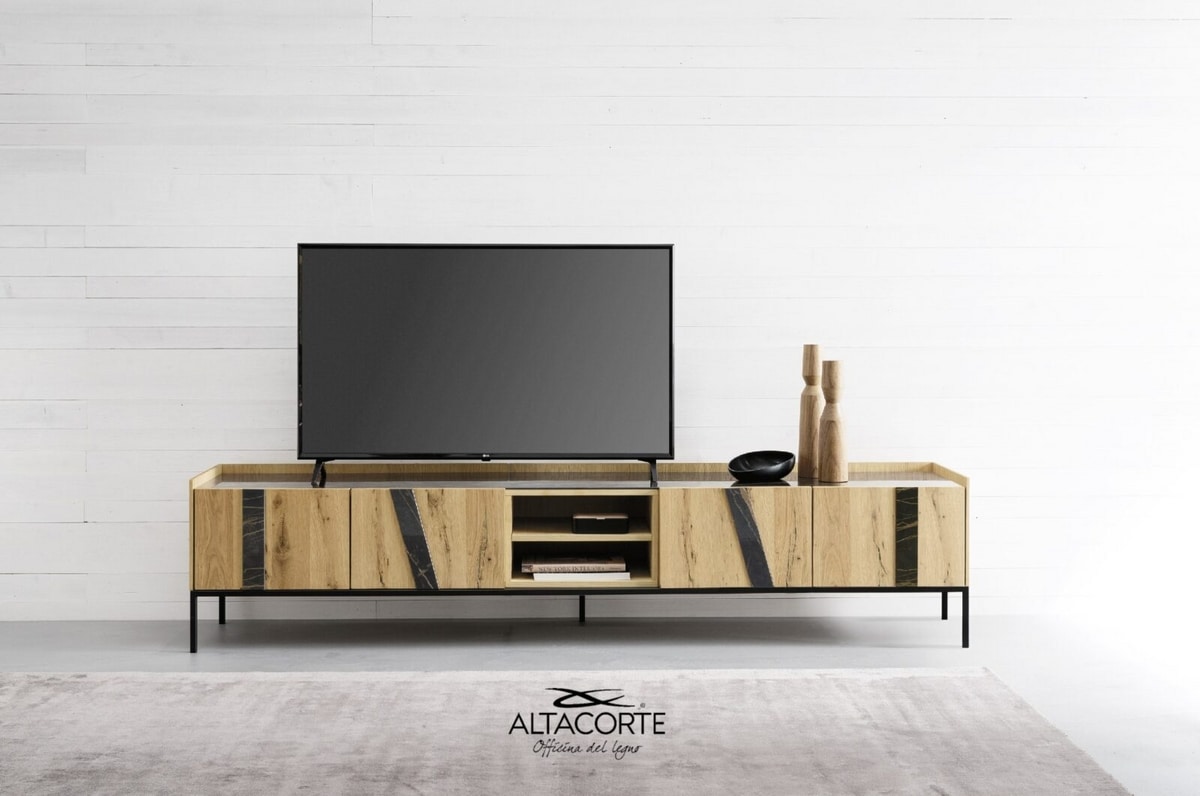 Meuble Tv moderne, de grand impact. Vous pourrez choisir parmi 500 combinaisons différentes entre portes, caissons et insertions, afin que chaque meuble TV soit complétement unique. Quelle combinaison choisiriez-vous ?