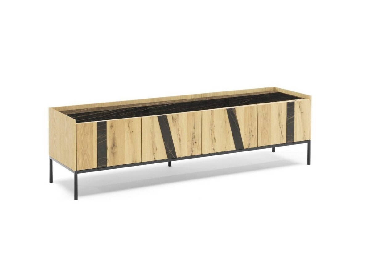 Caisson disponible en deux versions : en chêne ou texturé. Les portes sont en chêne. Piètement en acier laqué époxy ou oxydé avec une finition acrylique, ou en plexiglas transparent extra clair ép. 15 mm.