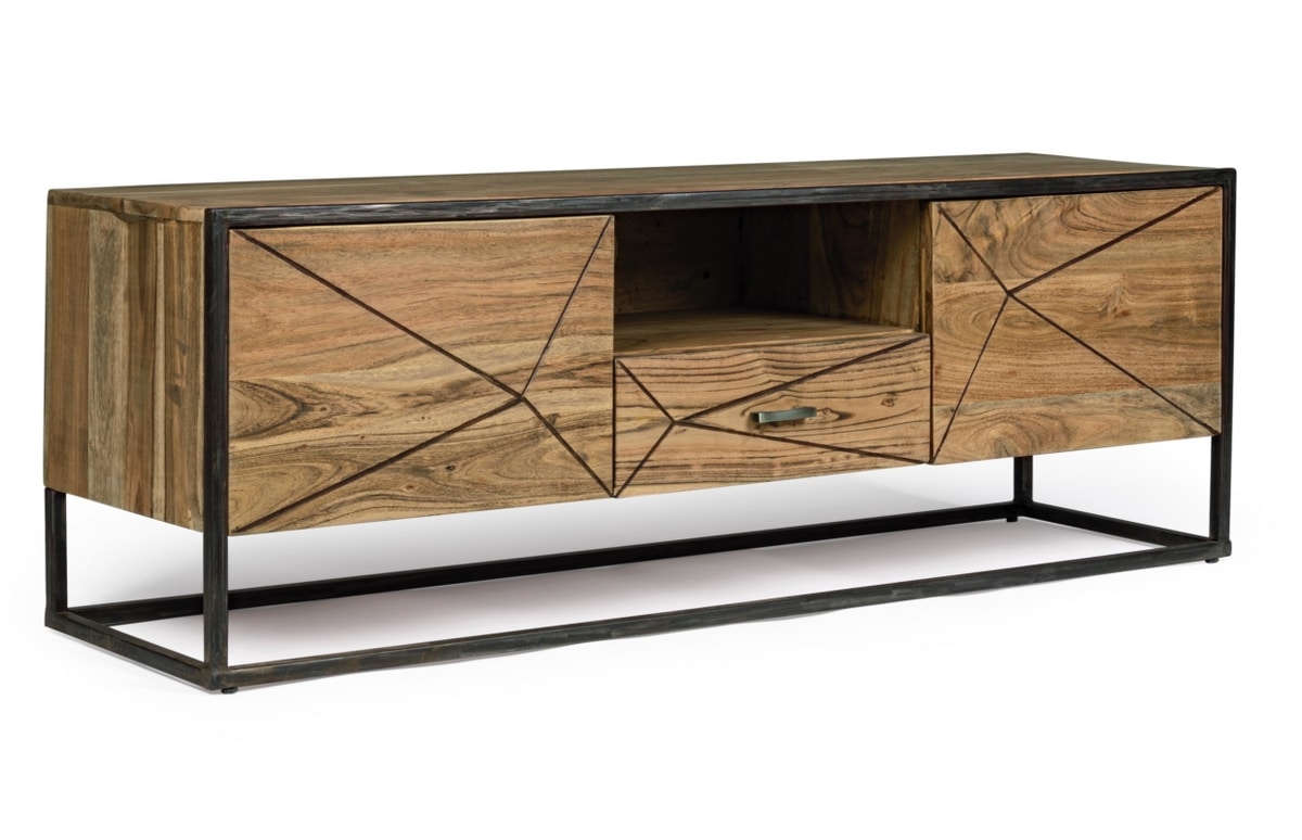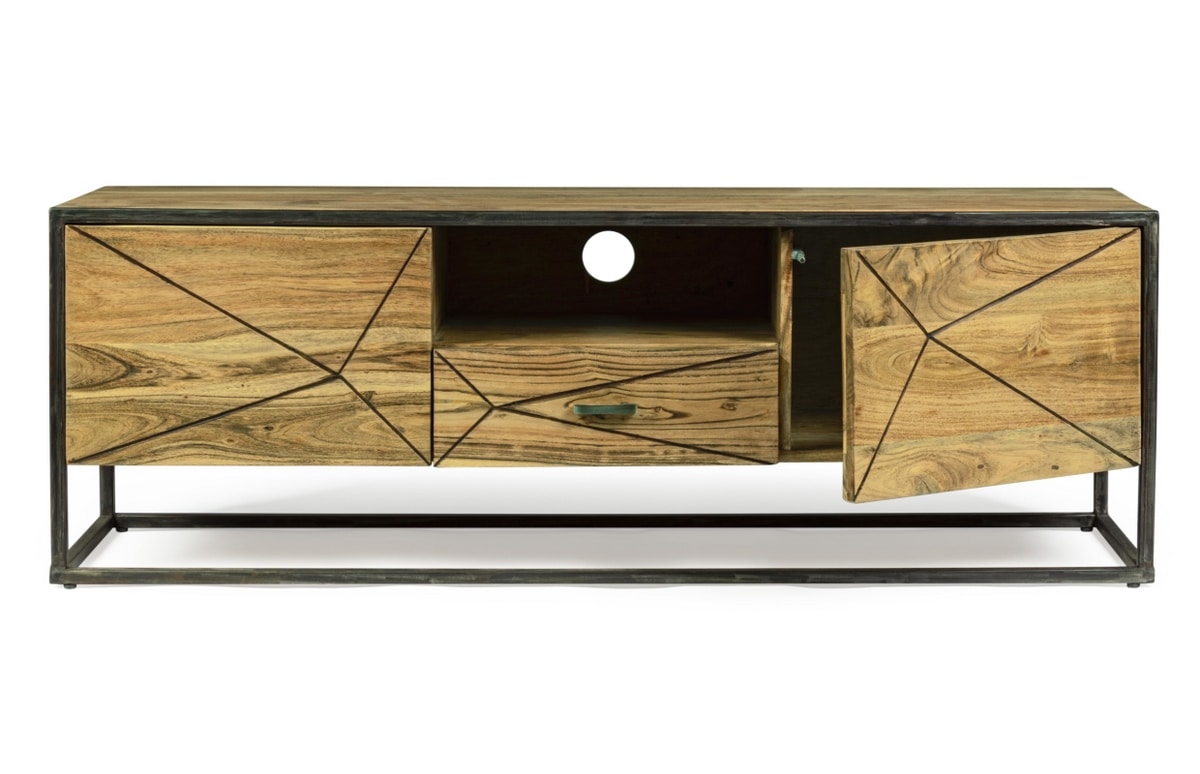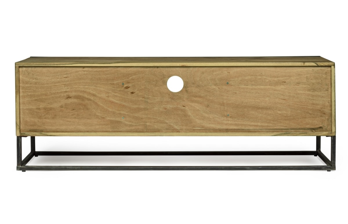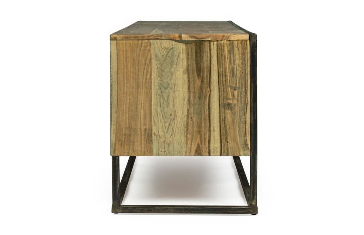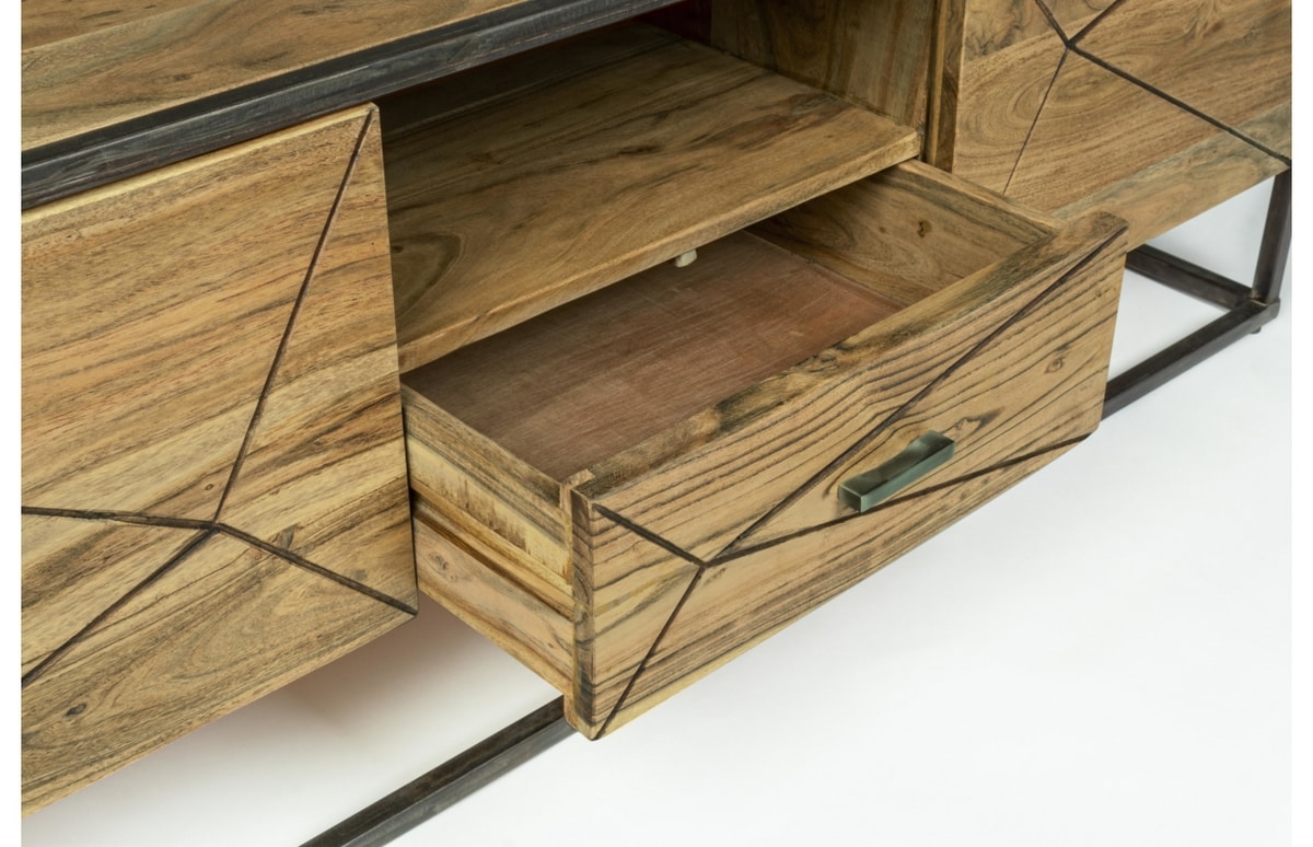 Meuble de télévision avec structure en bois d'acacia et acier revêtu de poudre époxy, dos en contreplaqué. Finition acrylique protectrice. Poignées en acier.