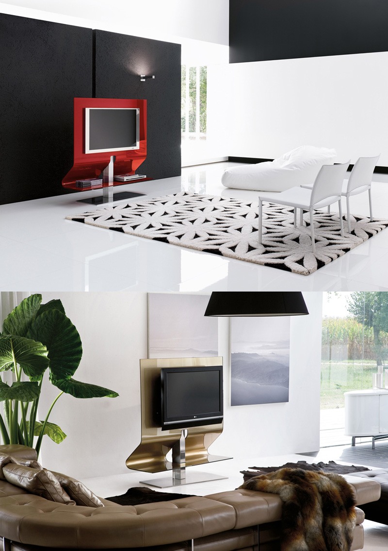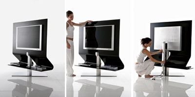 Meuble TV orientable en verre courbé adapté à la salle à manger, salon, chambre, salle d'exposition. Structure en verre bombé; base en métal, le soutien en acier inoxydable satiné avec cale de disparaître pour le câblage.