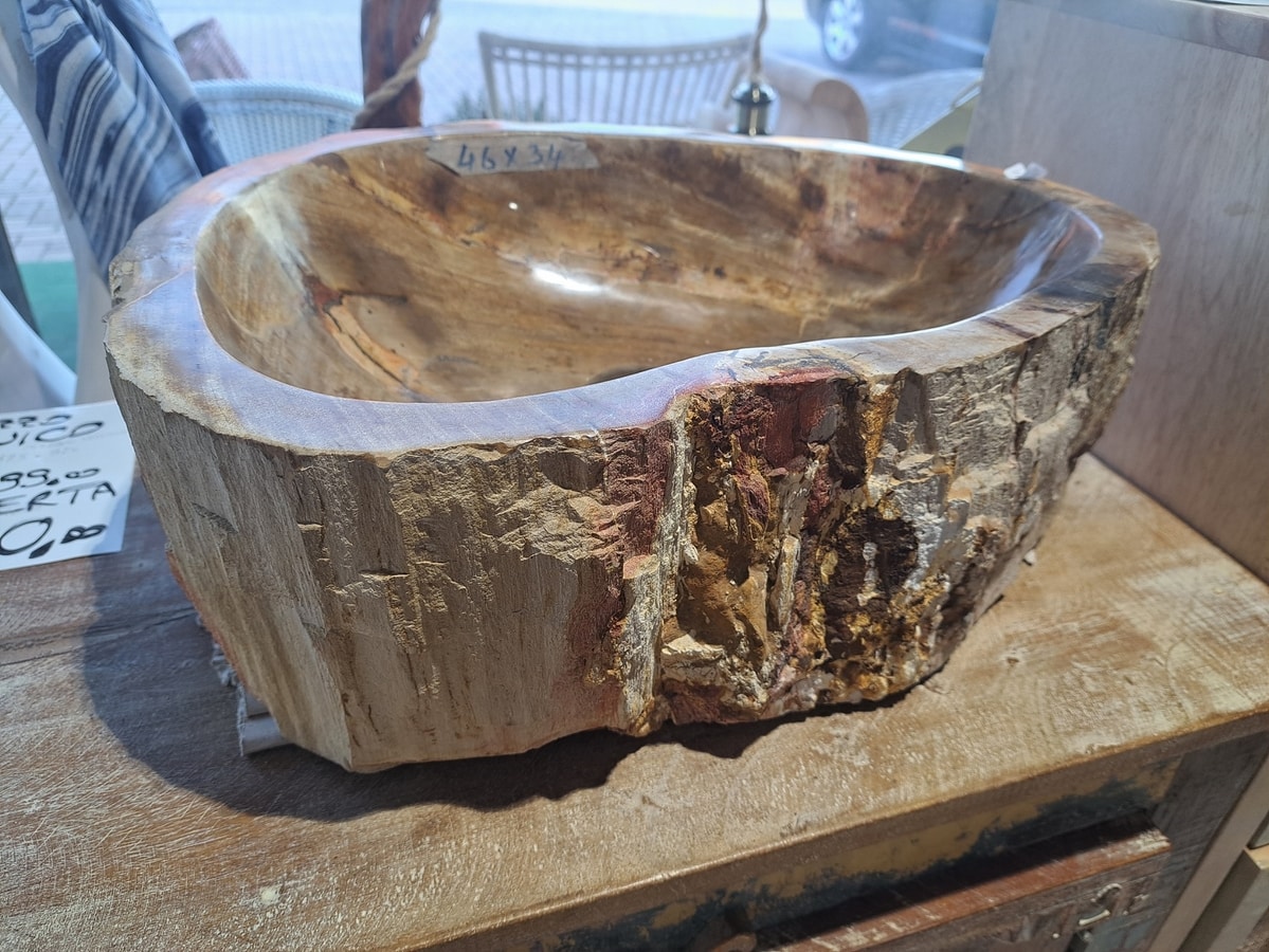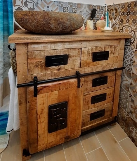 Armoire de salle de bain en acacia solide et bois de mangue, avec des inserts en fer. Pierre de lave ou évier en bois fossile. Collection de style industriel moderne, qui peut être combinée dans divers environnements.