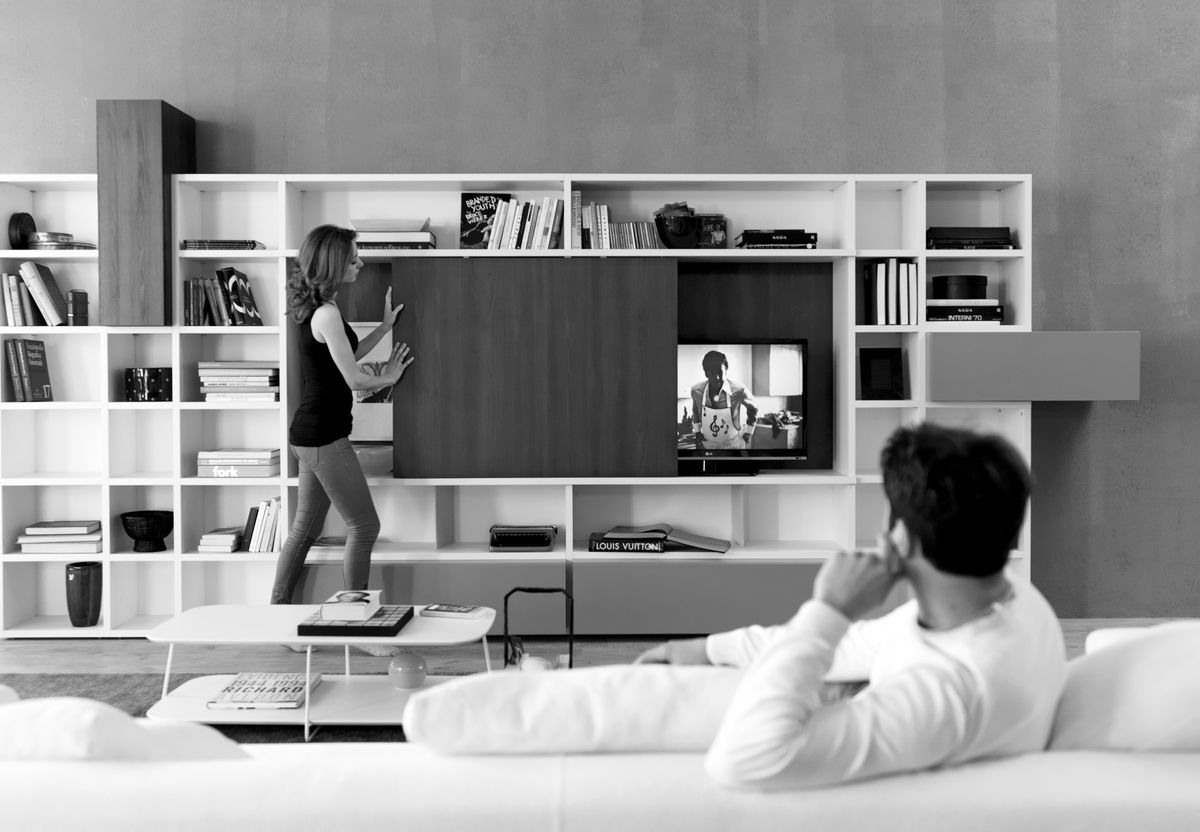 Plus de bibliothèque intelligente , avec des éléments de temps et coulissant à commande TV de porte .