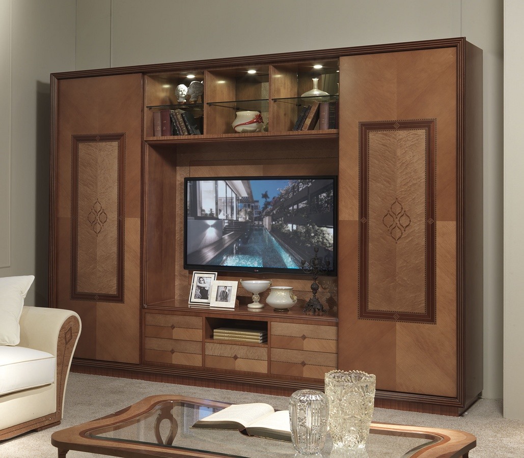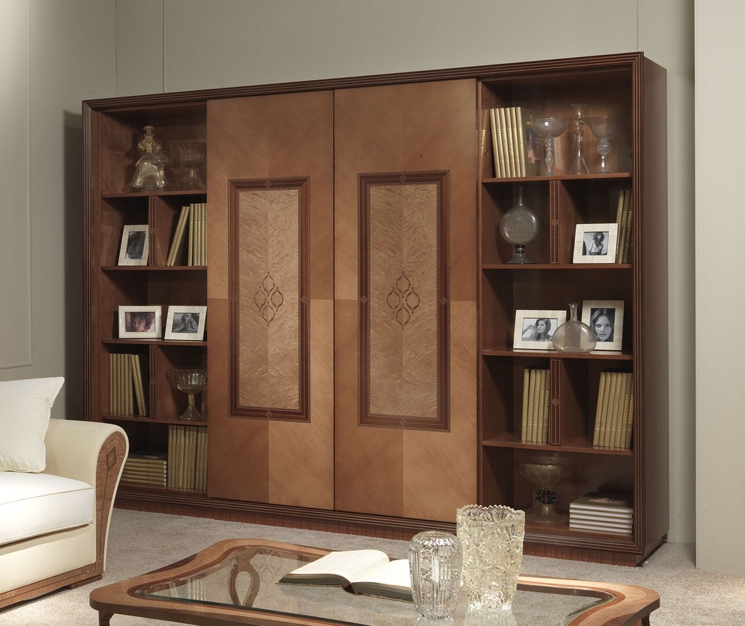 Bibliothèque "Charme" en bois marqueté, avec des portes coulissantes et des tiroirs, faites dans un style contemporain et classique, idéal pour la vie de luxe chambre.