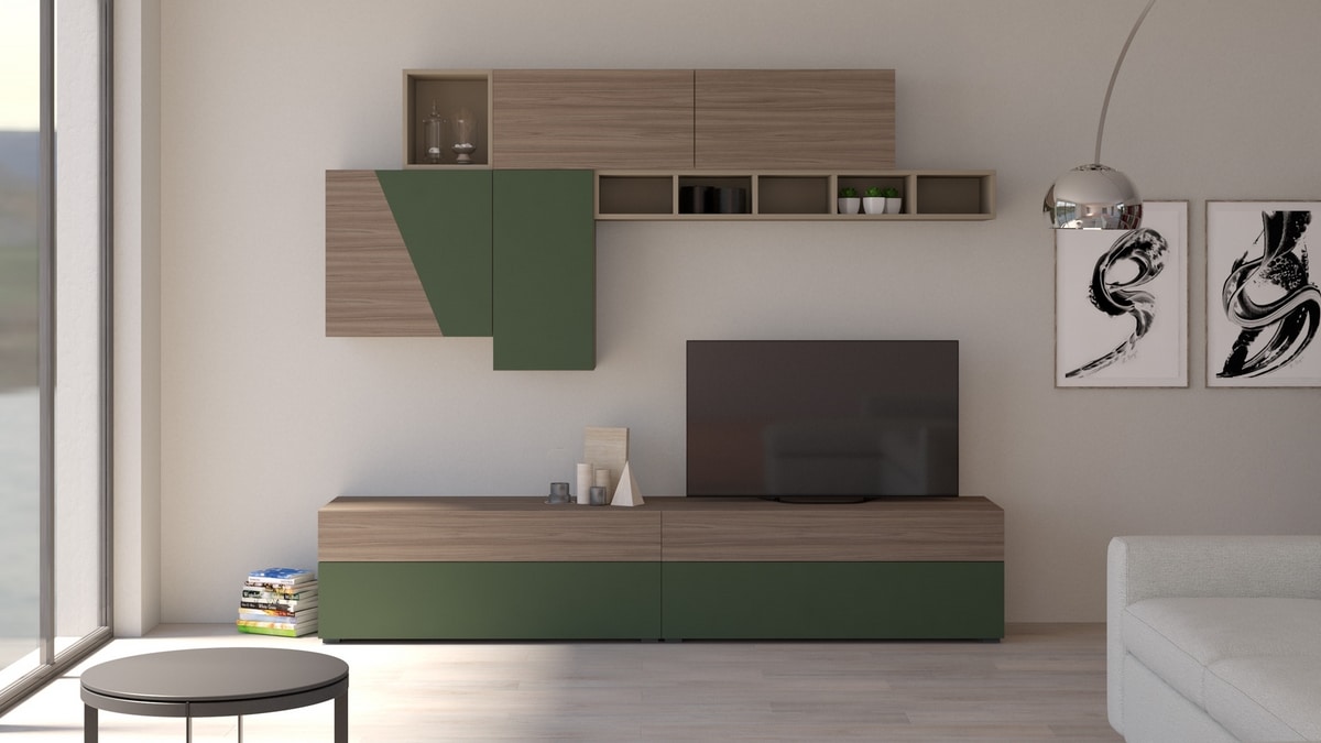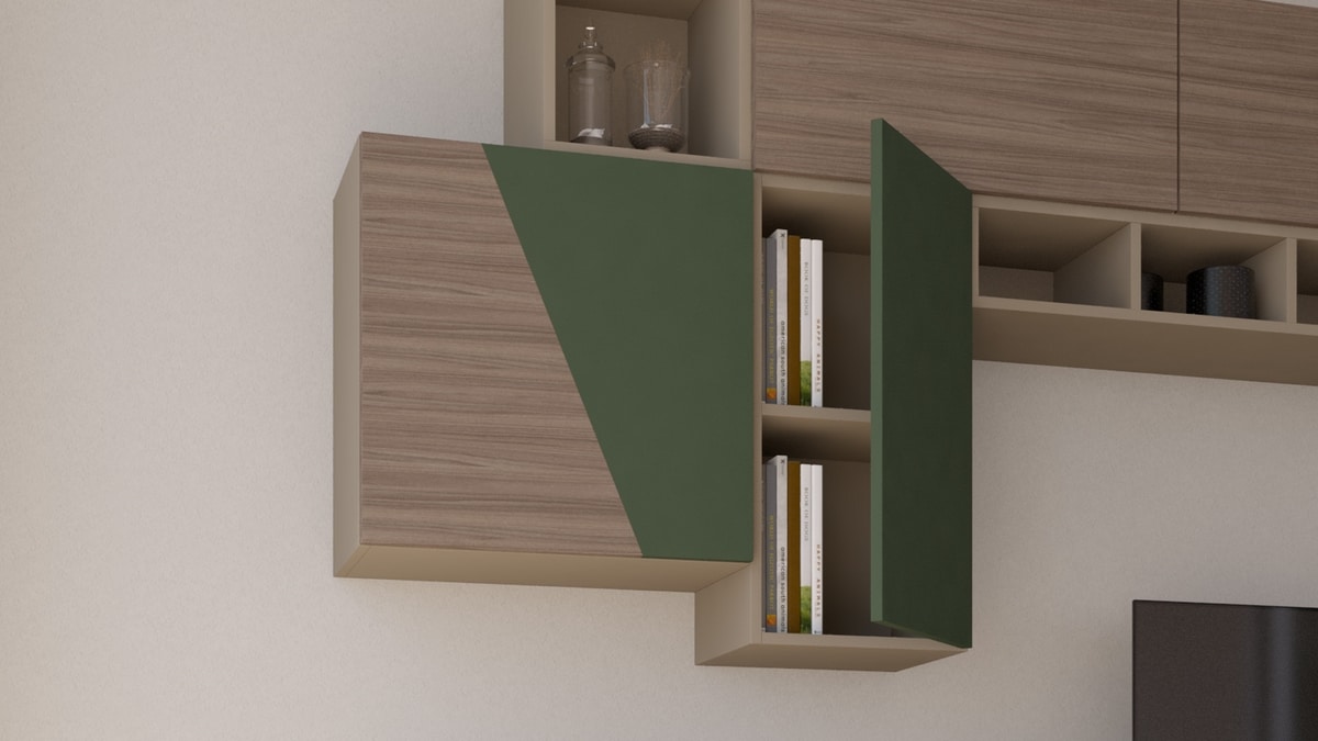 Zeus Green éclate sur Tobacco Walnut, créant un contraste audacieux et vibrant. Le grain du bois dialogue avec l'intensité de la laque, tandis que les armoires flottantes sont disposées avec équilibre. Un mur qui fusionne force naturelle et énergie chromatique, façonnant un espace à la fois vital et accueillant.