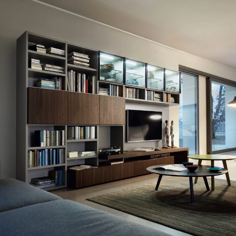 - Meuble TV avec système de pliage laqué ardoise mat et éléments de rangement au sol LAMPO saillants avec panneaux frontaux épaisseur 35 mm et plateau 60 mm avec design C et placage chêne traité thermiquement
