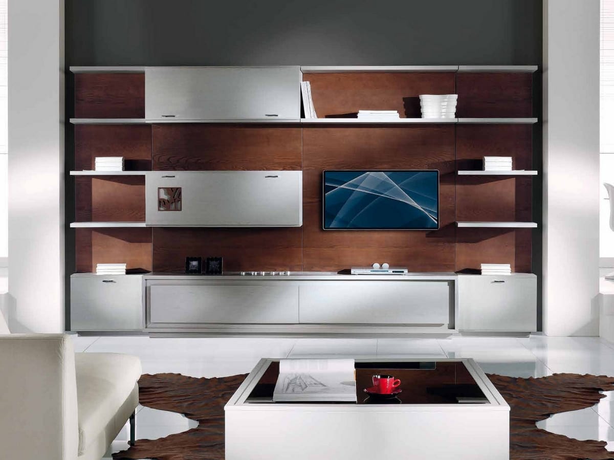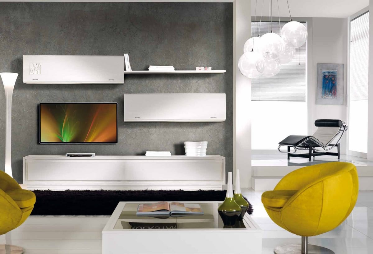 Système de mur pour le salon, avec des éléments suspendus et des étagères qui peuvent être repositionnés selon les besoins du client. Design minimal idéal pour un mobilier moderne.