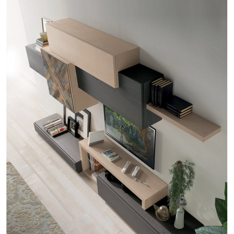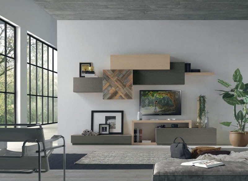 Mobilier de salon moderne avec deux bases avec des paniers et un élément joyeux, réglable en largeur. Dans la partie supérieure, il y a une unité murale en vrai bois de récupération antique et quelques autres unités murales.