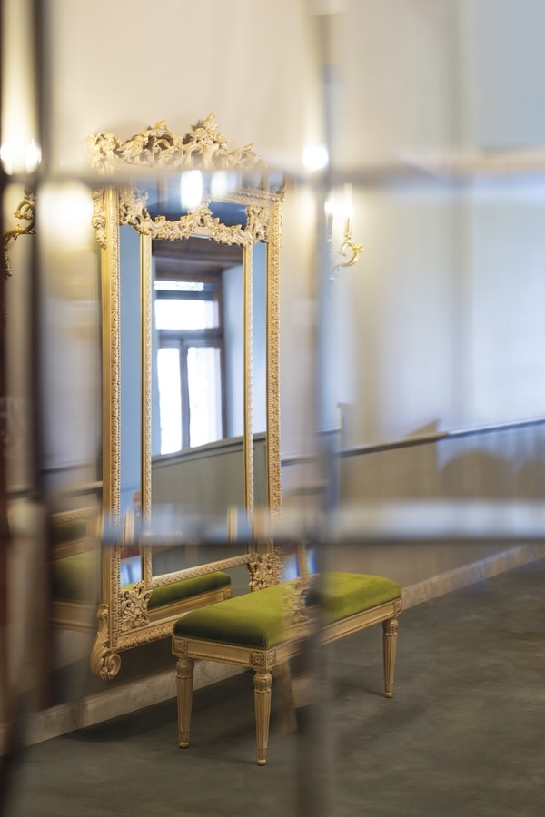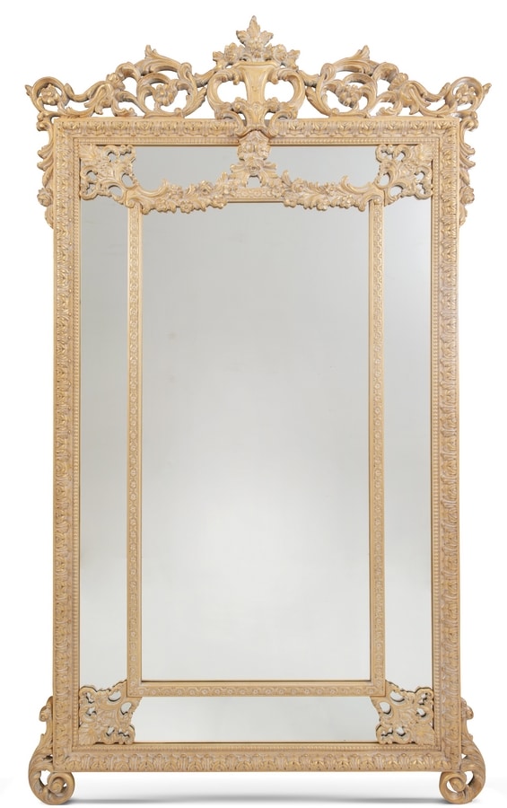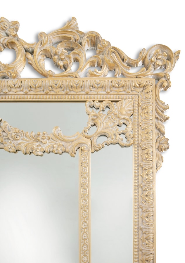 Miroir avec un cadre en bois finement caduné, orné de motifs floraux et de défilement classique qui améliorent sa silhouette verticale. La finition Och - feuille dorée avec une patine blanche de meringue - ajoute de la profondeur et de l'élégance intemporelle.