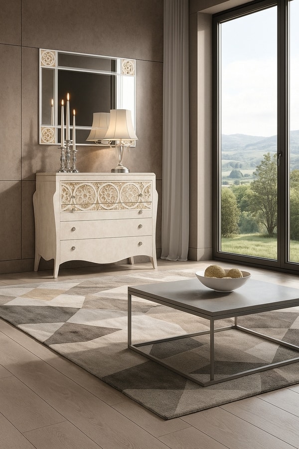 Demander prix Produits similairesLe miroir 1638 s'intègre parfaitement au design contemporain de la collection Élégance grâce à ses lignes épurées et ses détails géométriques en relief, disponibles en plusieurs variantes décoratives. Sa surface est recouverte de laques écologiques à base d'eau, personnalisables dans une large gamme de couleurs et de nuances pour s'adapter à tous les intérieurs. Élément d'ameublement polyvalent et raffiné, le miroir 1638 peut être associé à la chambre Élégance ou utilisé seul pour sublimer les entrées, salons et chambres modernes.