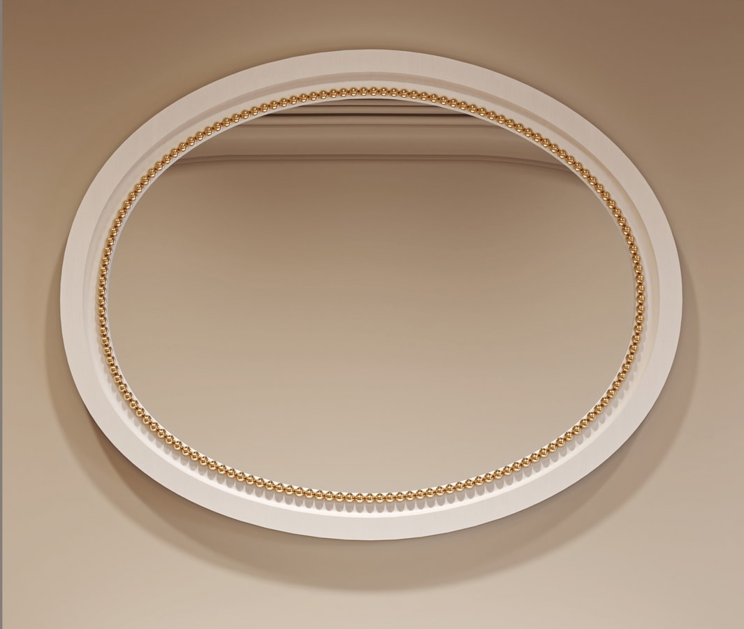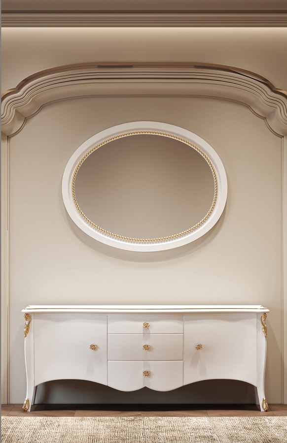 Miroir ovale avec cadre en bois laqué, décorations finition dorée.