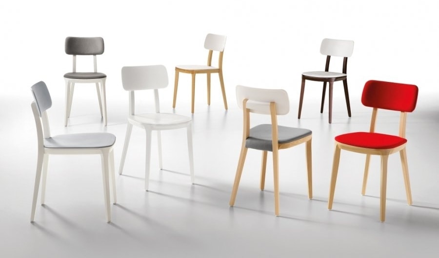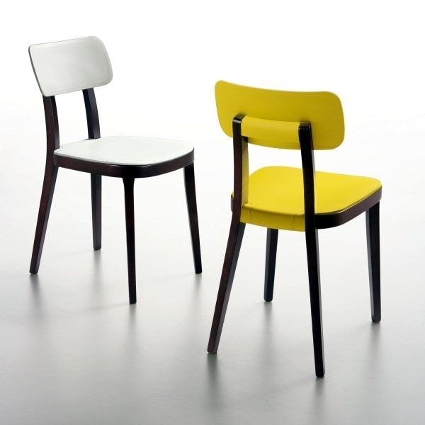 Chaise avec structure en bois de hêtre naturel massif, assise en polypropylène wenghe, laqué blanc ou noir, avec échantillons de couleurs.