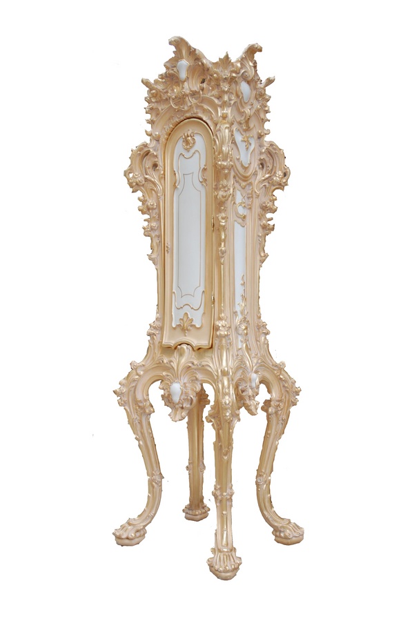 L'horloge de Superb Luis XV grand-père avec des sculptures complexes sur les côtés et à l'avant. Le corps est dans une finition à la feuille d'or et une délicate couleur blanche avec patine blanche, montrant harmonieusement au large de la fabrication artisanale. Les travaux mécaniques visibles sont placés sur une mère de visage de perles. L'horloge de ce grand-père a un look très distingué et artistique, principalement créé par les jambes anormalement hautes et belle apparence. Certainement une pièce intemporelle.