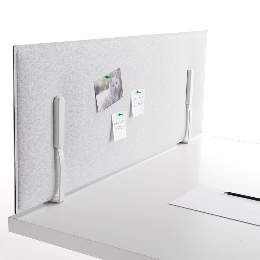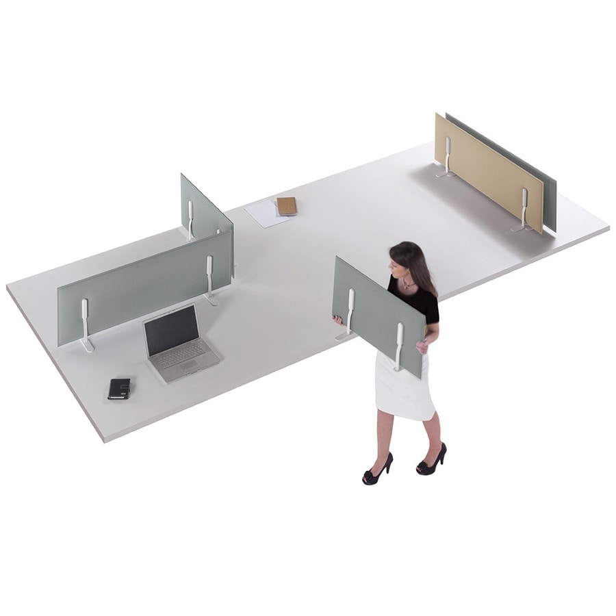 A travers des étriers spéciaux en acier peint, il est possible d’appuyer les panneaux Mitesco sur le dessus de façon qu’il soit possible de changer rapidement de configuration au niveau du plan de travail.