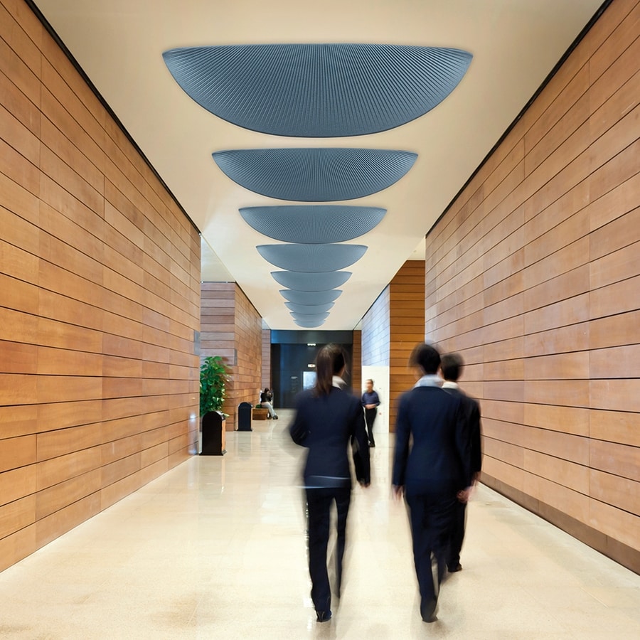 Le tissu plissé enrobe une structure portante en métal. Il est facilement amovible pour être lavé ou remplacé. Il peut être fixé à la paroi ou au plafond.
