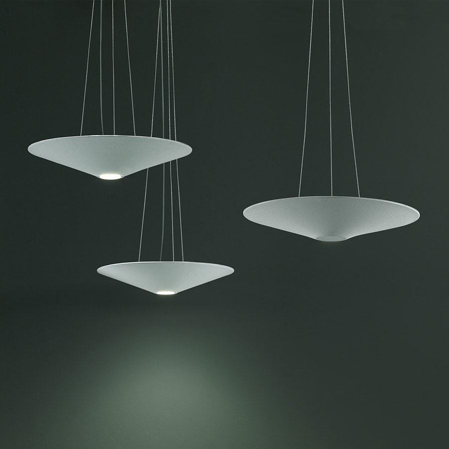 Eléments phono-absorbants tridimensionnels fixés au plafond, réalisés avec la technologie Snowsound, proposés avec ou sans lumière Led intégrée. Chaque élément est muni de 3 câbles en acier chromé pour la suspension au plafond, reliés à une seule plaque centrale. La ligne extrêmement légère de TL cache à l’intérieur la technologie Snowsound qui permet d’absorber le bruit.