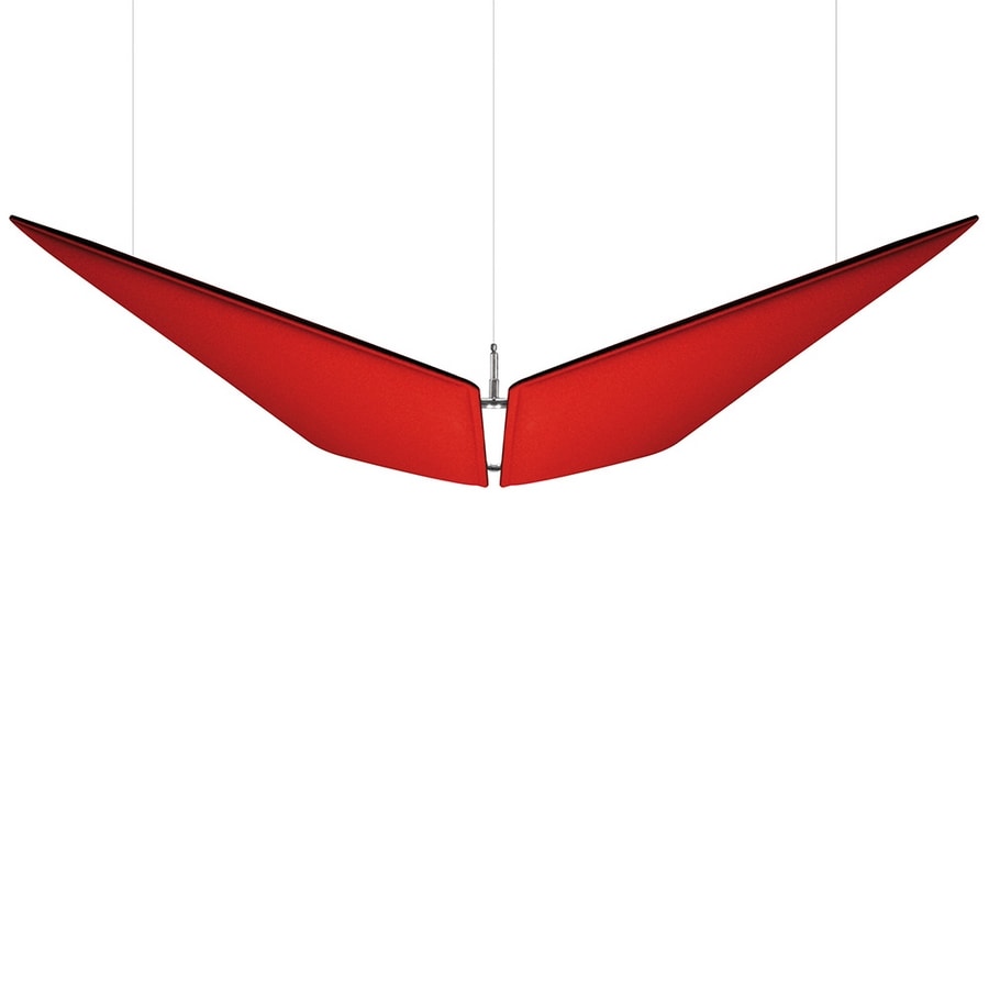 Le chassis en acier chromé, suspendu par de minces câbles en métal, et les deux panneaux phono-absorbants placés en position inclinée créent l’image de deux ailes qui volent dans l’espace.