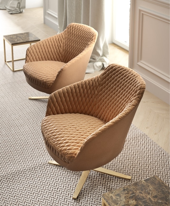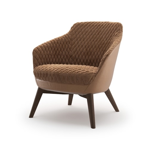 Katy, dans sa petite version, est un fauteuil très polyvalent, son design original, souligné ici par une housse matelassée, en fait le protagoniste absolu du contexte environnant. Capable de s'intégrer facilement dans différents environnements, il est disponible avec différentes bases en bois et en métal dans différentes finitions.