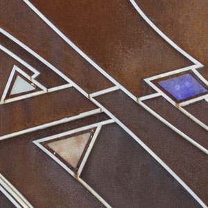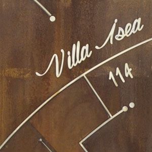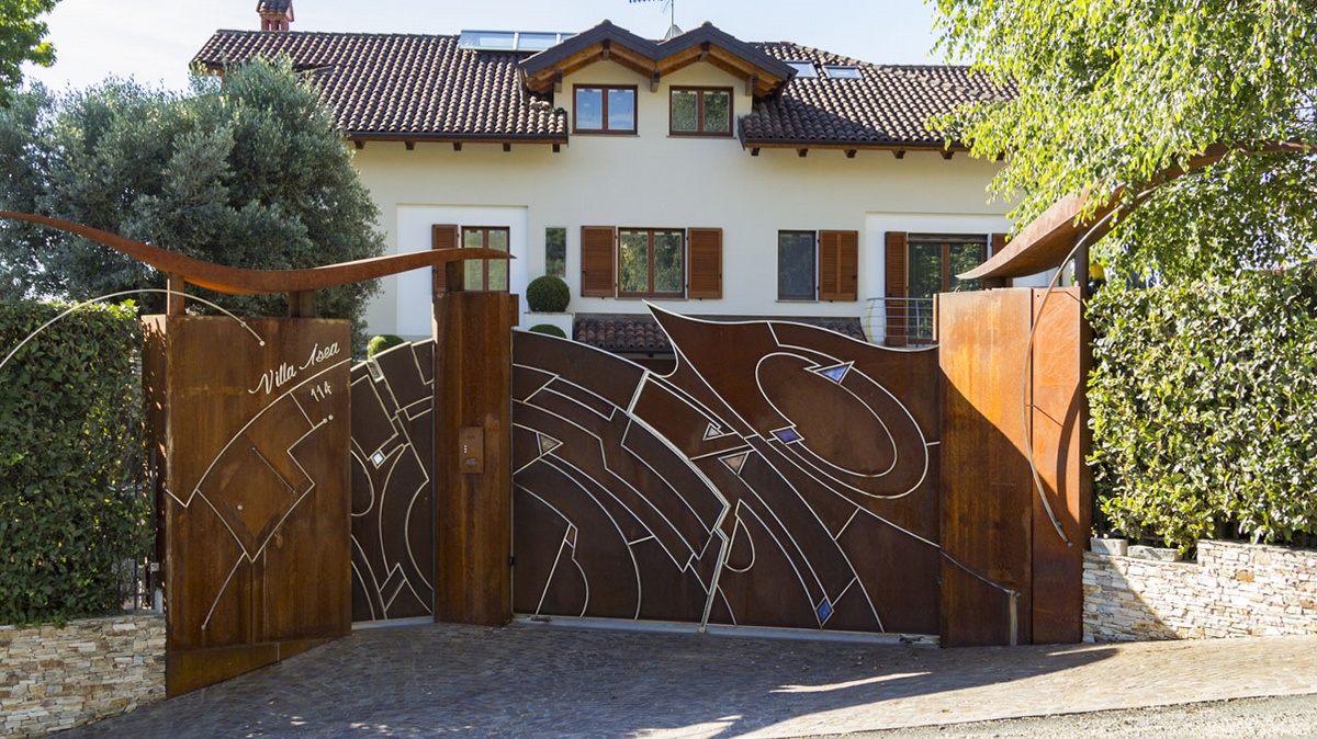 Porte Allée et porte piétonne, en cadre de forme en acier inoxydable, avec tamponnade en acier Corten avec des inserts en verre fondu, des abris en forme en acier corten, les piliers et les parois latérales entièrement recouverts d'acier corten, le tout sur l'artiste conception Elio Garis.