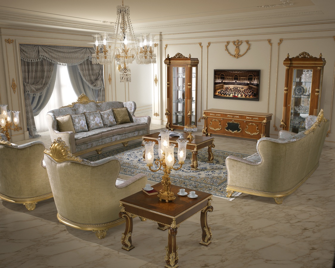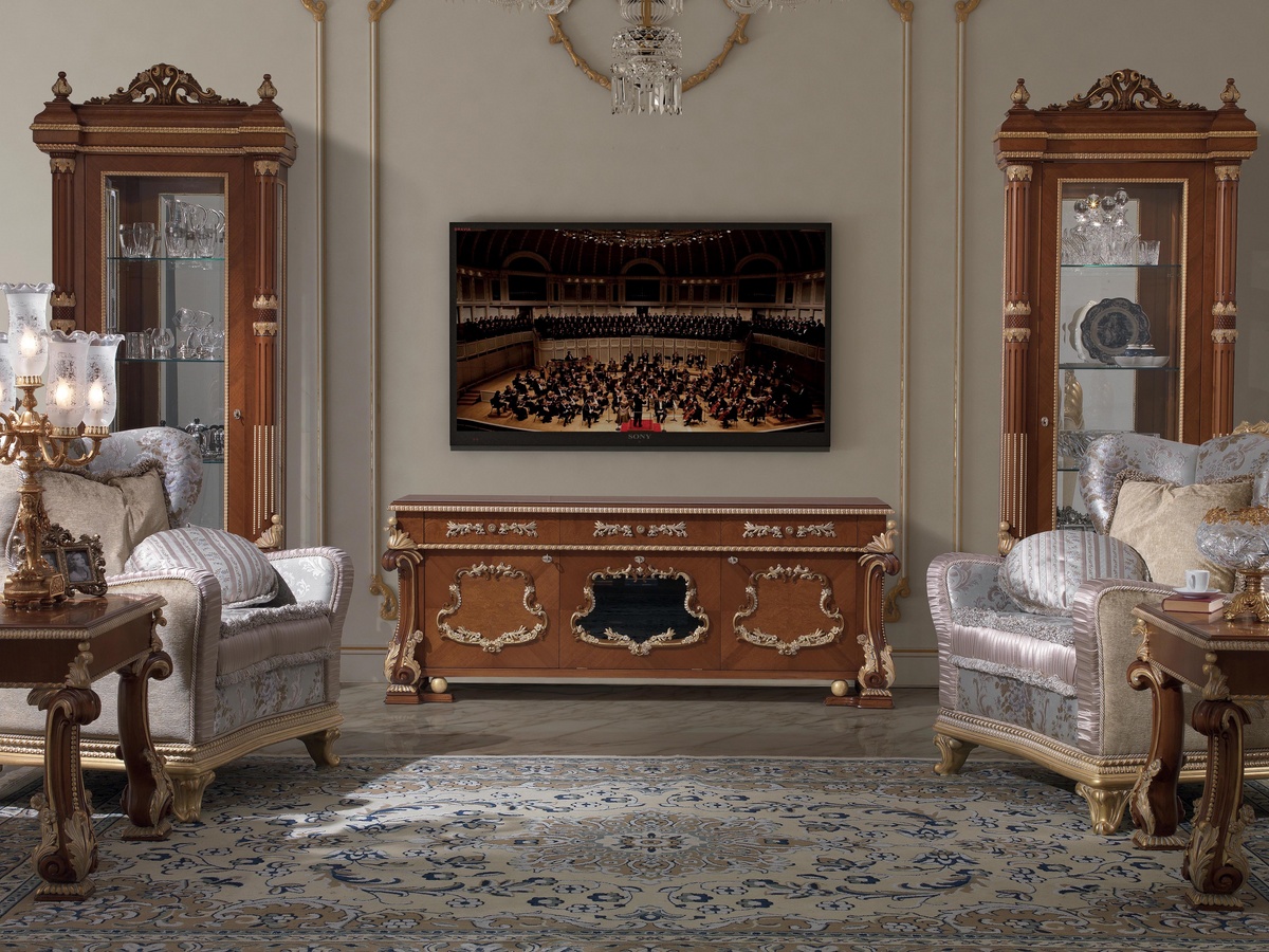 Produits similairesMeuble de télévision en noyer et racine de myrte, avec des détails en blanc d'or patiné. Cette armoire de télévision fait partie de la collection "Living Room Prestige".