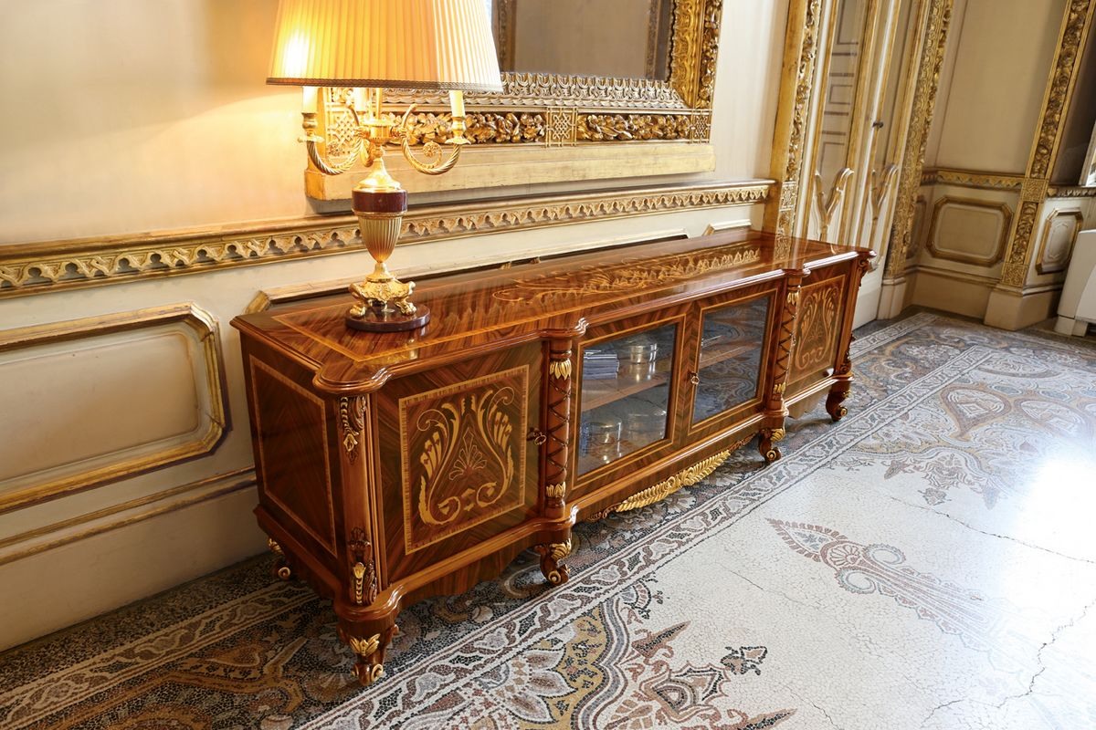Meuble de télévision classique de luxe, décoré à la main avec des sculptures précieuses et les incrustations.